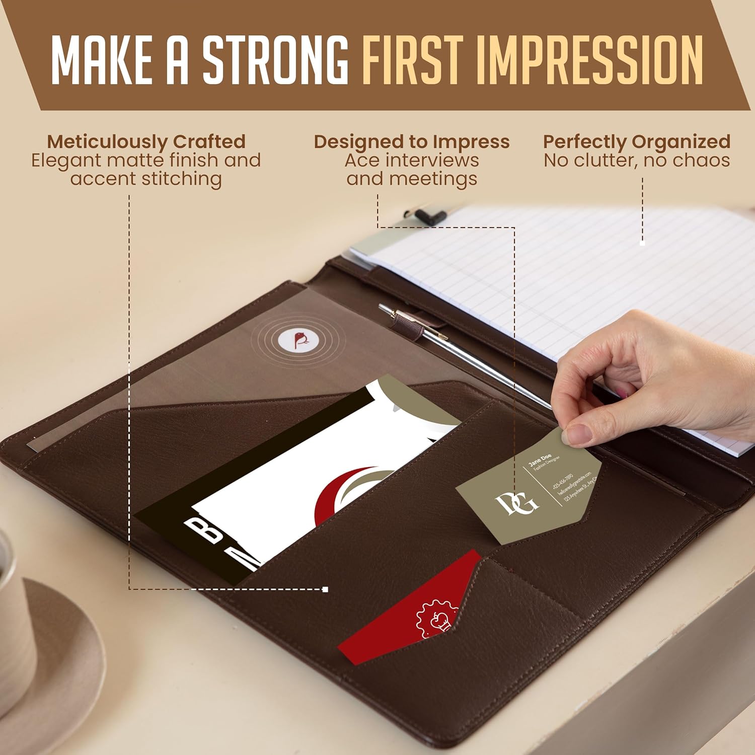 - ✅ PREMIUM FUNCTIONALITY & DURABILITY: Convenient, safe pockets ideal for documents, business cards, travel tickets, pitch proposals & resumes. Includes a pen holder & refillable writing notepad that you can use out of the box.
