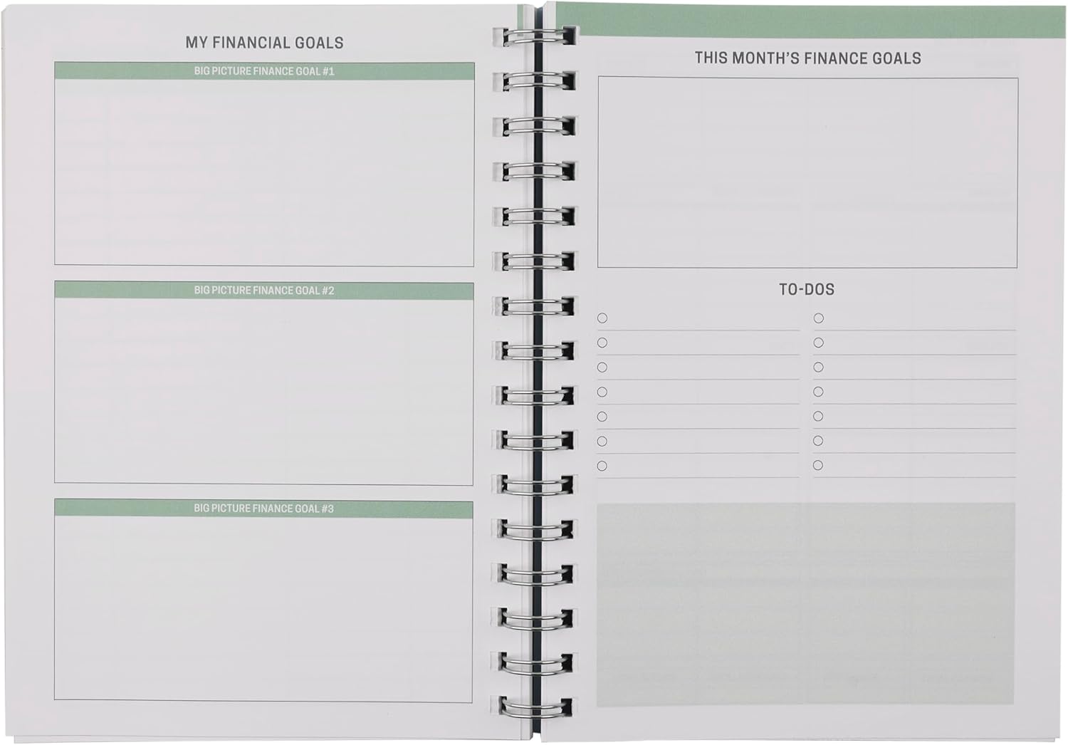 - DETAILED FINANCIAL TRACKING: Includes monthly finance goal setting, budgeting overviews, weekly spending logs, bill trackers, and more.