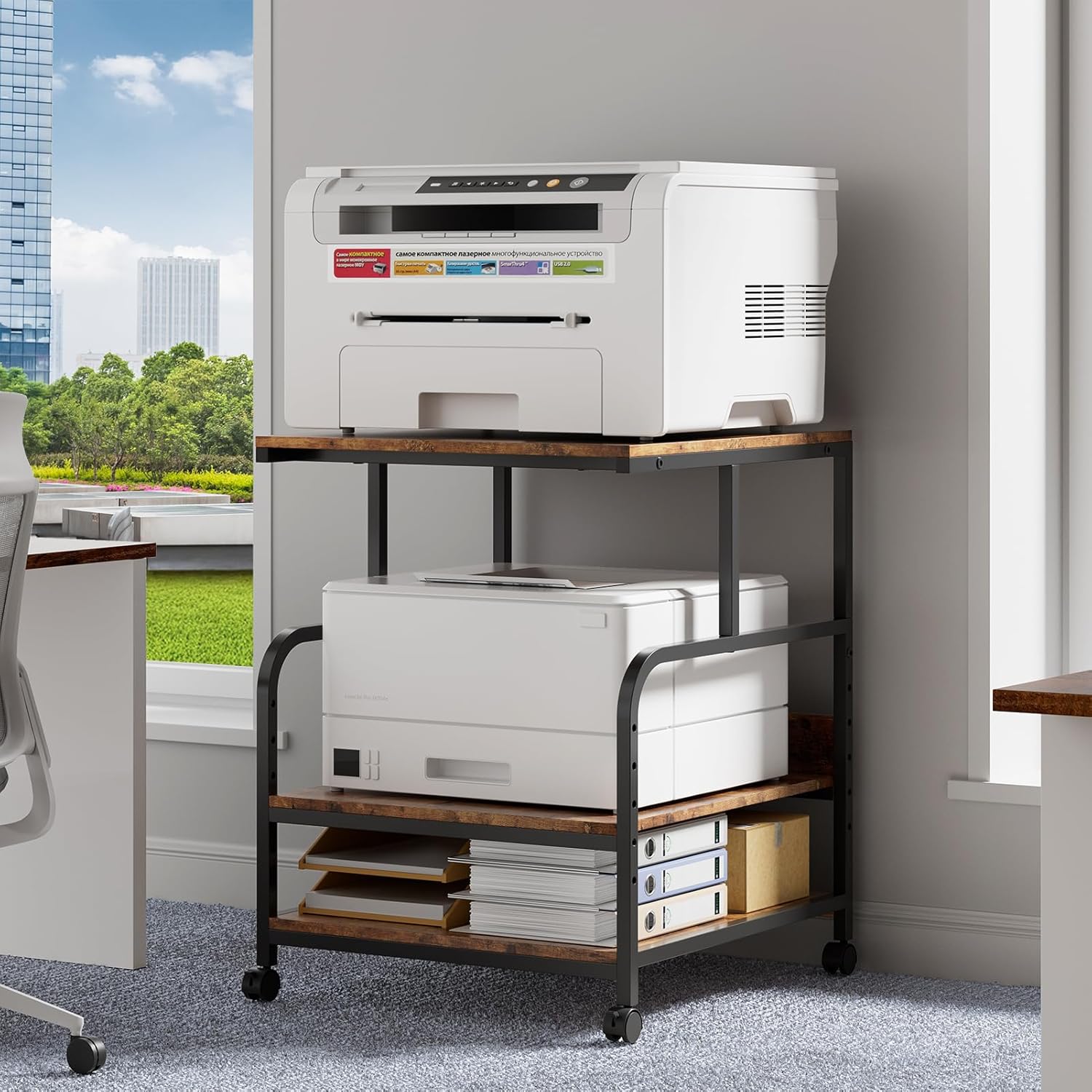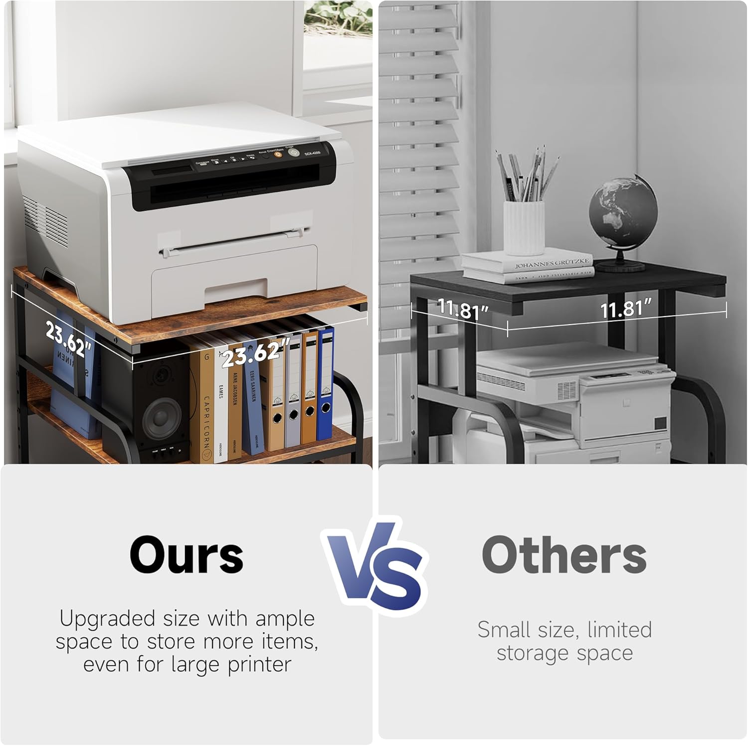- 【Oversized Countertops Storage Space】 3 layers of 23.62x23.62" printer countertops space is available to accommodate large items. Can be used to store printers, scanners, fax machines as well as copy paper, folders, books, letters, documents, etc. It is an ideal homes office printer stand with storage.