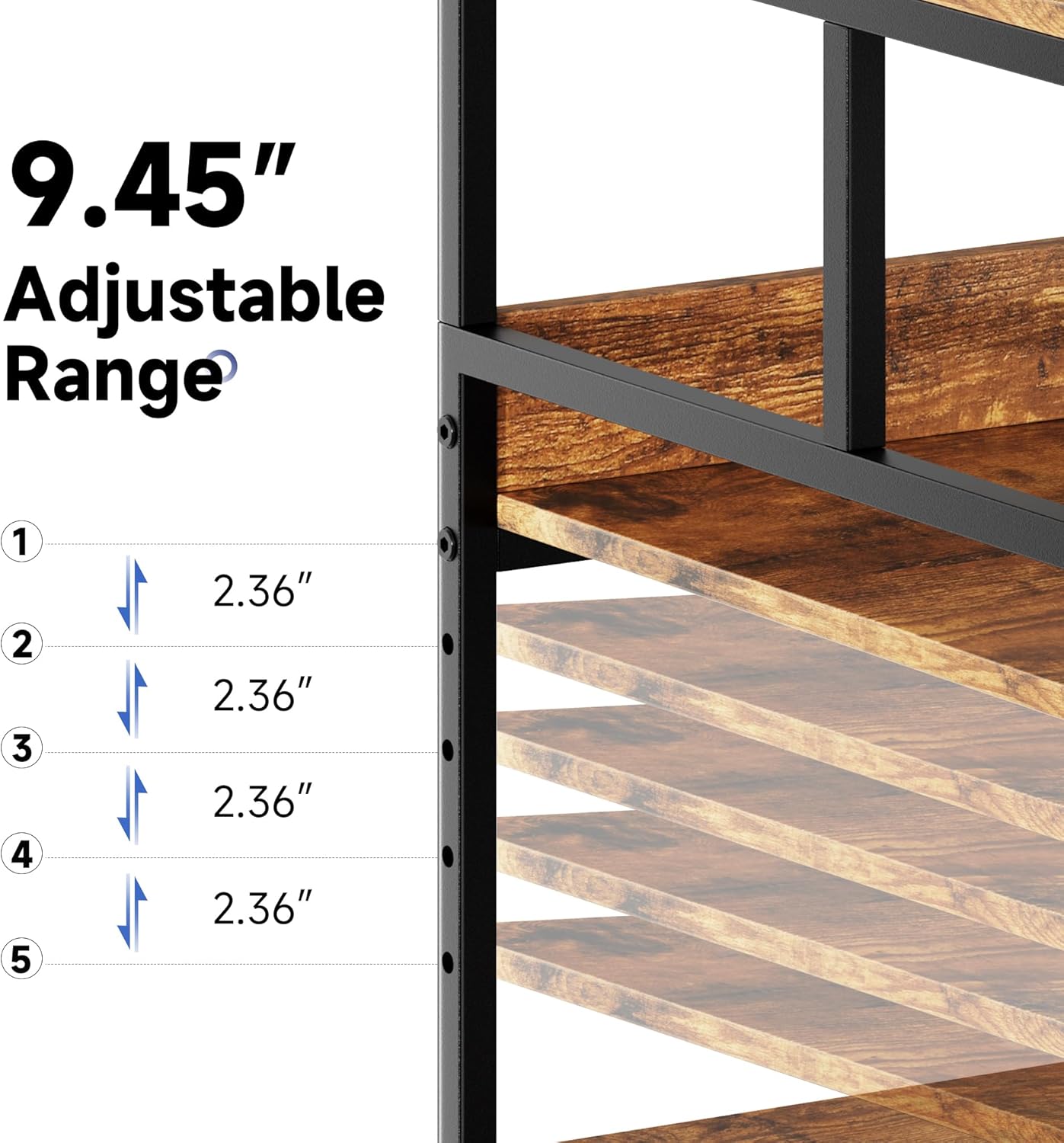 - 【9.45" Adjustable Height Range】 With 5 gears totaling 9.45 inches adjustable height range, the middle shelf of the large printer table can be customized by you to accommodate differently sized items. Experience the flexibility and versatility of customizable storage options with this innovative printer stand shelf.