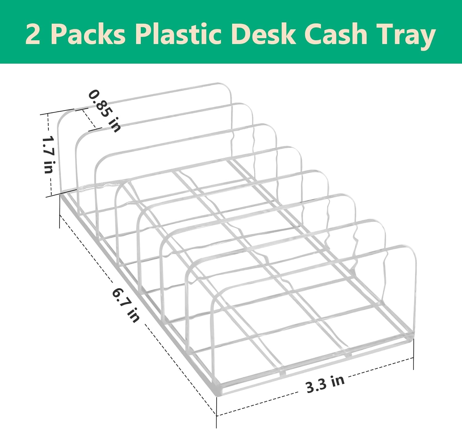 - Product Info:Package included 2 packs plastic cash organizer,each with 7 compartments, keep them organized and easy to find, to meet your needs for storing different desk products.6.7 ”x3.34 “x1.57”