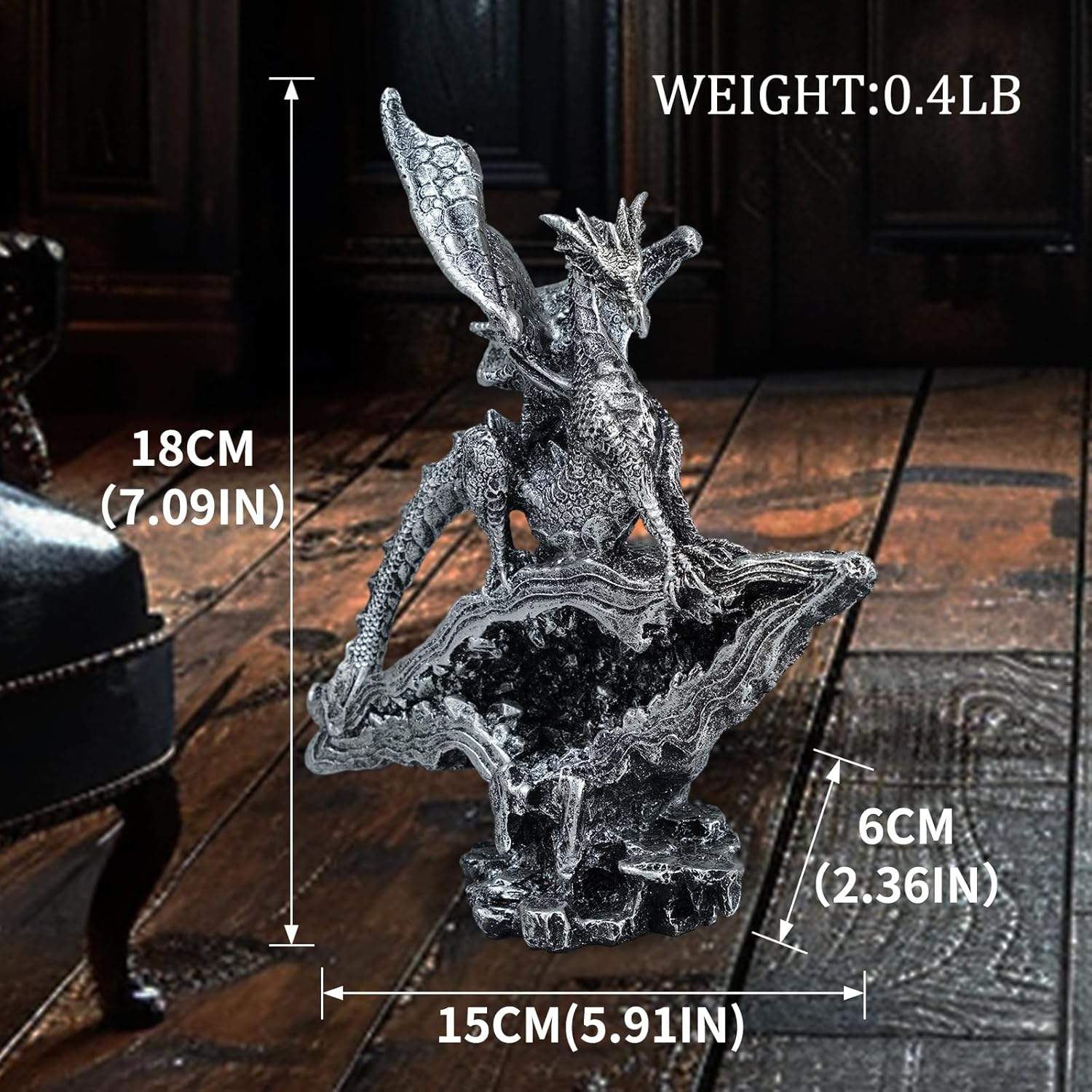 - 【Size】Size: 5.9''L x 2.36''W x 7'' H. Add an attractive atmosphere to your home with this silver mythic gothic dragon statue.
