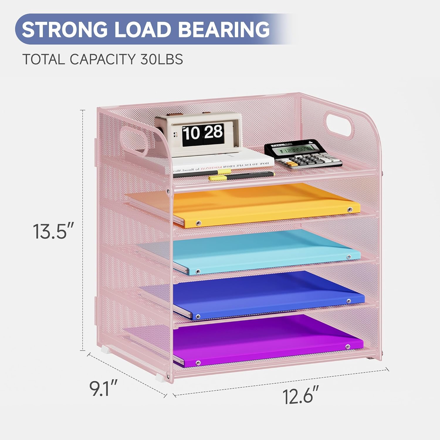 5 Tier Paper Organizer with Handle, Metal Mesh Desk Organizer File Folder Paper Letter Tray Desktop Document Sorter for Classroom, School, Office Accessories Organization and Storage - Pink
