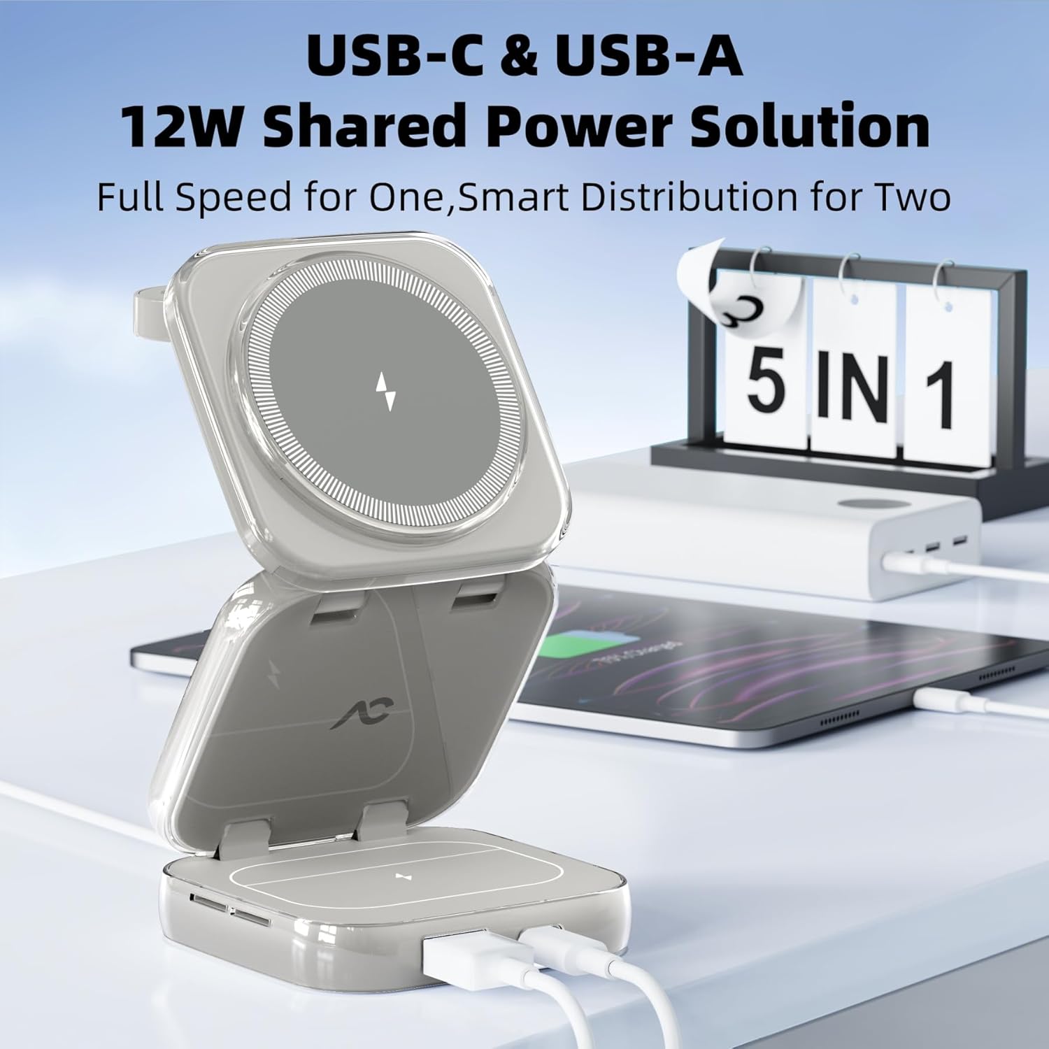 - Upgraded 5 in 1 Exclusively for Apple: Transform your charging experience with our upgraded USB-C & USB-A base, revolutionizing the conventional 3-in-1 station. Enjoy comprehensive wireless charging for your iPhone, iWatch, AirPods, iPad, and other USB-powered devices. Note: The USB-C & USB-A ports deliver full-speed charging for a single device and smartly adjust when charging two devices simultaneously.