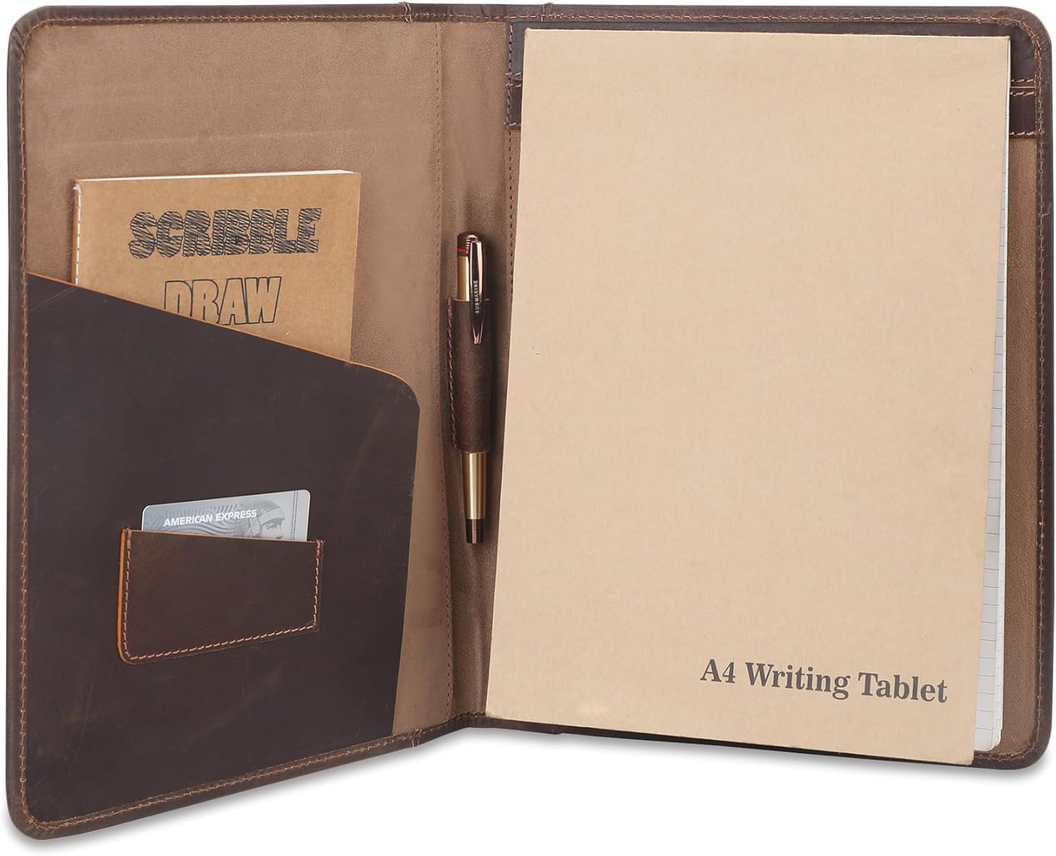 - PERFECT STORAGE - Leather folder with the size of 13” x 10”, give you a plenty of storage. A sleeve holder perfect for the legal pad writing pads and A4 notepads & paper sheet, 1 pen slot, 1 wave-shaped business card holder and 1 side pockets for documents. This wonderful leather notepad construct without annoying zipper will organize your paper stuff very well. And what is more, it will add your confidence and great first impression definitely.