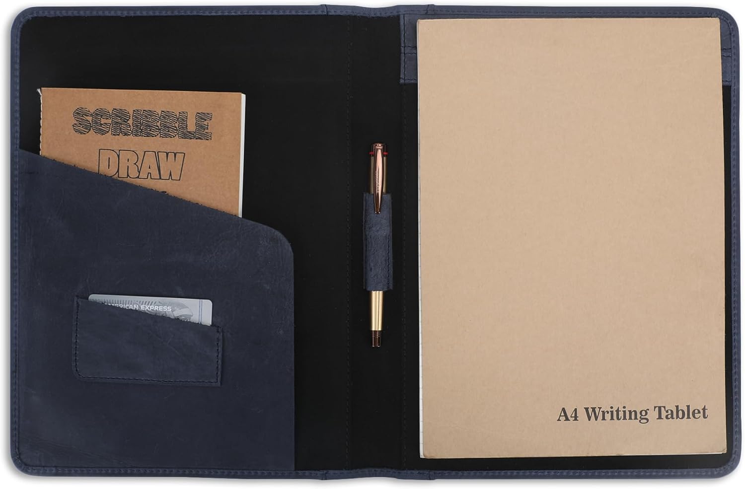 - PERFECT STORAGE - Leather folder with the size of 13” x 10”, give you a plenty of storage. A sleeve holder perfect for the legal pad writing pads and A4 notepads & paper sheet, 1 pen slot, 1 wave-shaped business card holder and 1 side pockets for documents. This wonderful leather notepad construct without annoying zipper will organize your paper stuff very well. And what is more, it will add your confidence and great first impression definitely.
