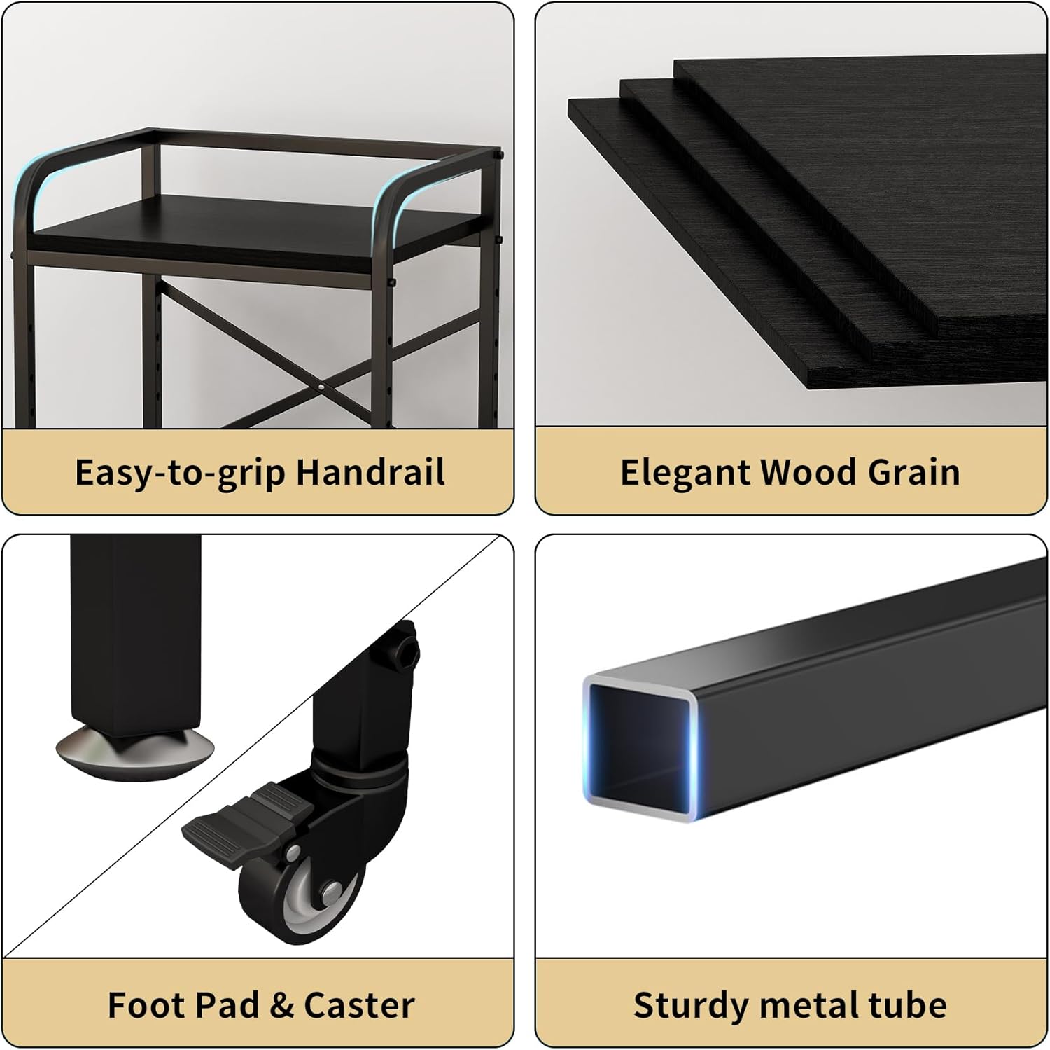 - Durable Construction: This printer table features two metal tubes under each board, serving as load-bearing crossbars, and is reinforced with an X-shaped steel sheet to create a more stable frame. The metal tubes are powder-coated to prevent rust and resist wear. The wooden boards, crafted from particleboard, boast a clear wood grain, combining aesthetic appeal with practicality.