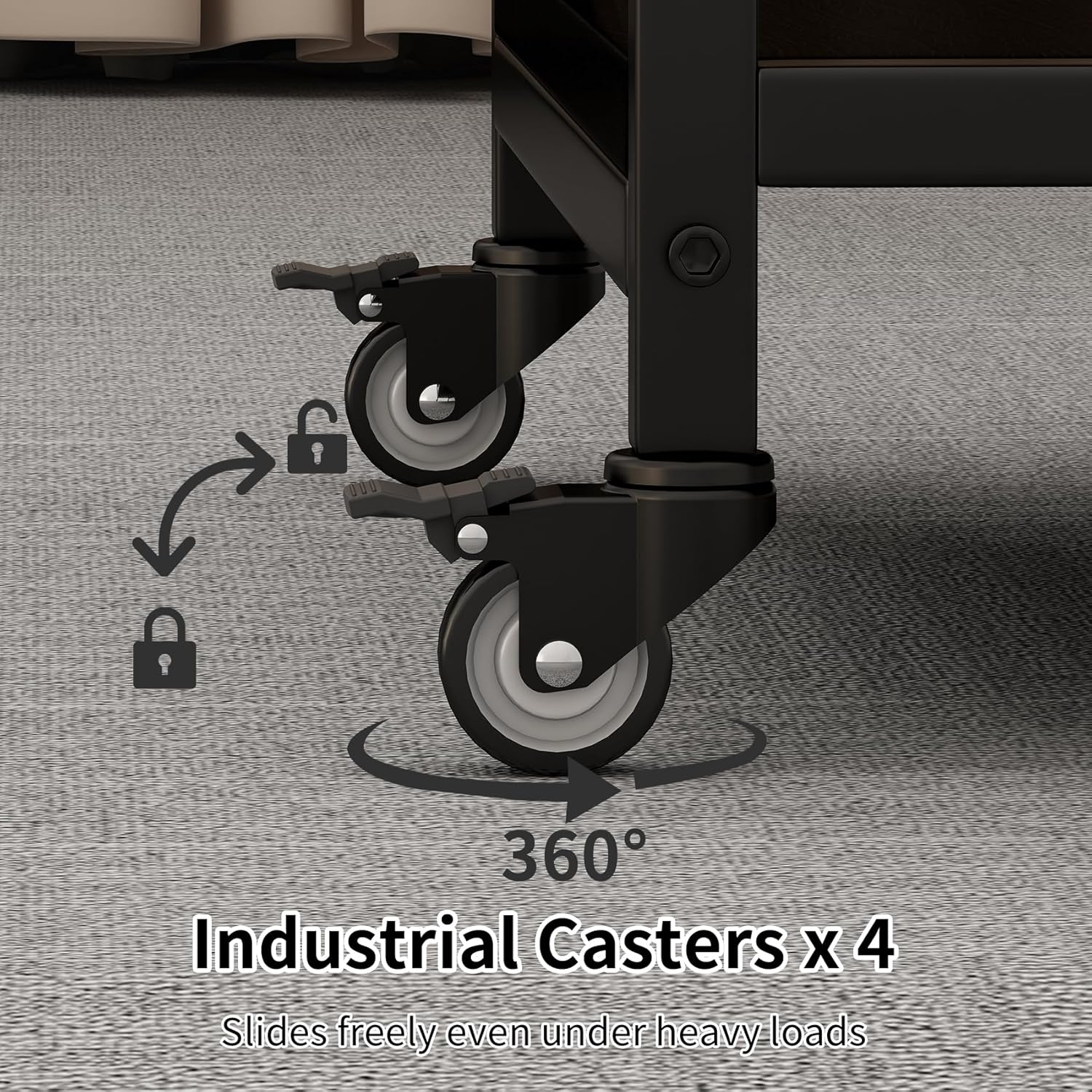 - Casters and Foot Pads Included: This under-desk printer stand features 4 ball-bearing swivel casters with brakes, allowing easy movement with loads or on carpets. For stationary use, secure it with the included foot pads. Whether you require frequent repositioning or a stable setup, this printer stand meets your needs.