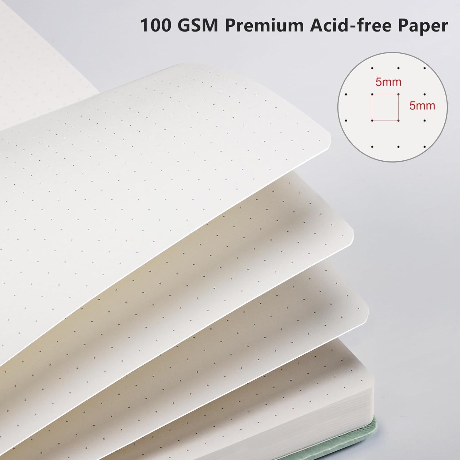 - PREMIUM PAPER: Crafted with time-resistant 100 GSM paper, this dotted journal preserves thoughts flawlessly while resisting ghosting/bleed-through with most pens. Acid-free material ensures long-term preservation, and its smooth surface enhances writing clarity - blending durability and premium performance