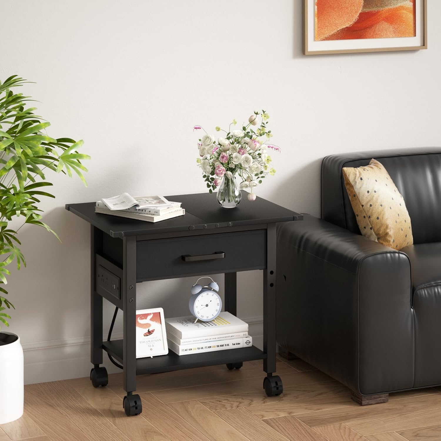 Lerliuo Under Desk Rolling Printer Stand with Charging Station and USB Ports, 2-Tier Printer Table Desk with Fabric Drawer, Printer Cart Holder with Lockable Wheels for Home, Office (Black)