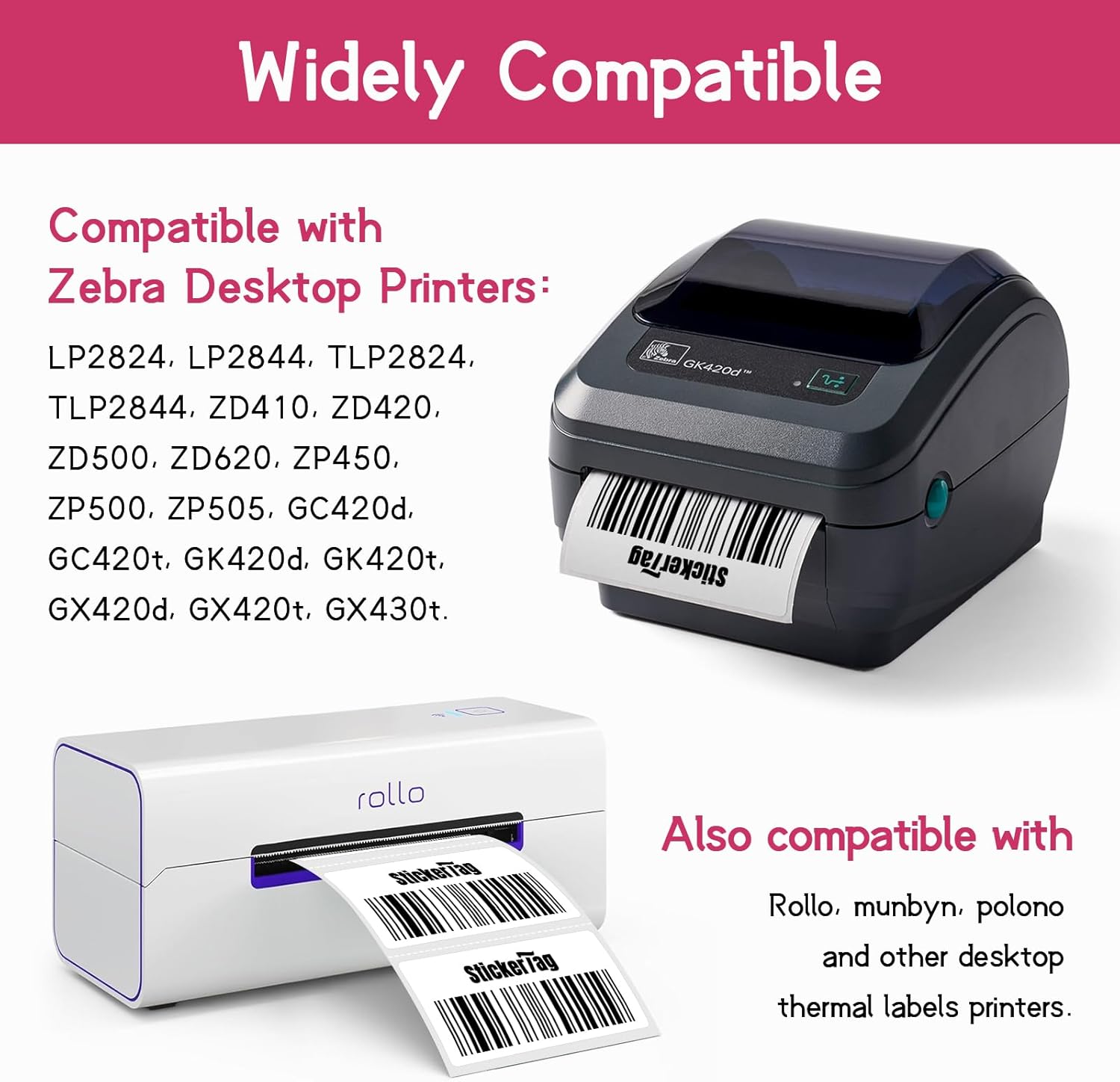 - Compatibility: Compatible with Zebra Desktop Printers: LP2824, LP2844, TLP2824, TLP2844, ZD410, ZD420, ZD500, ZD620, ZP450, ZP500, ZP505, GC420d, GC420t, GK420d, GK420t, GX420d, GX420t, GX430t. Also compatible with Rollo, munbyn, polono and other desktop thermal labels printers.