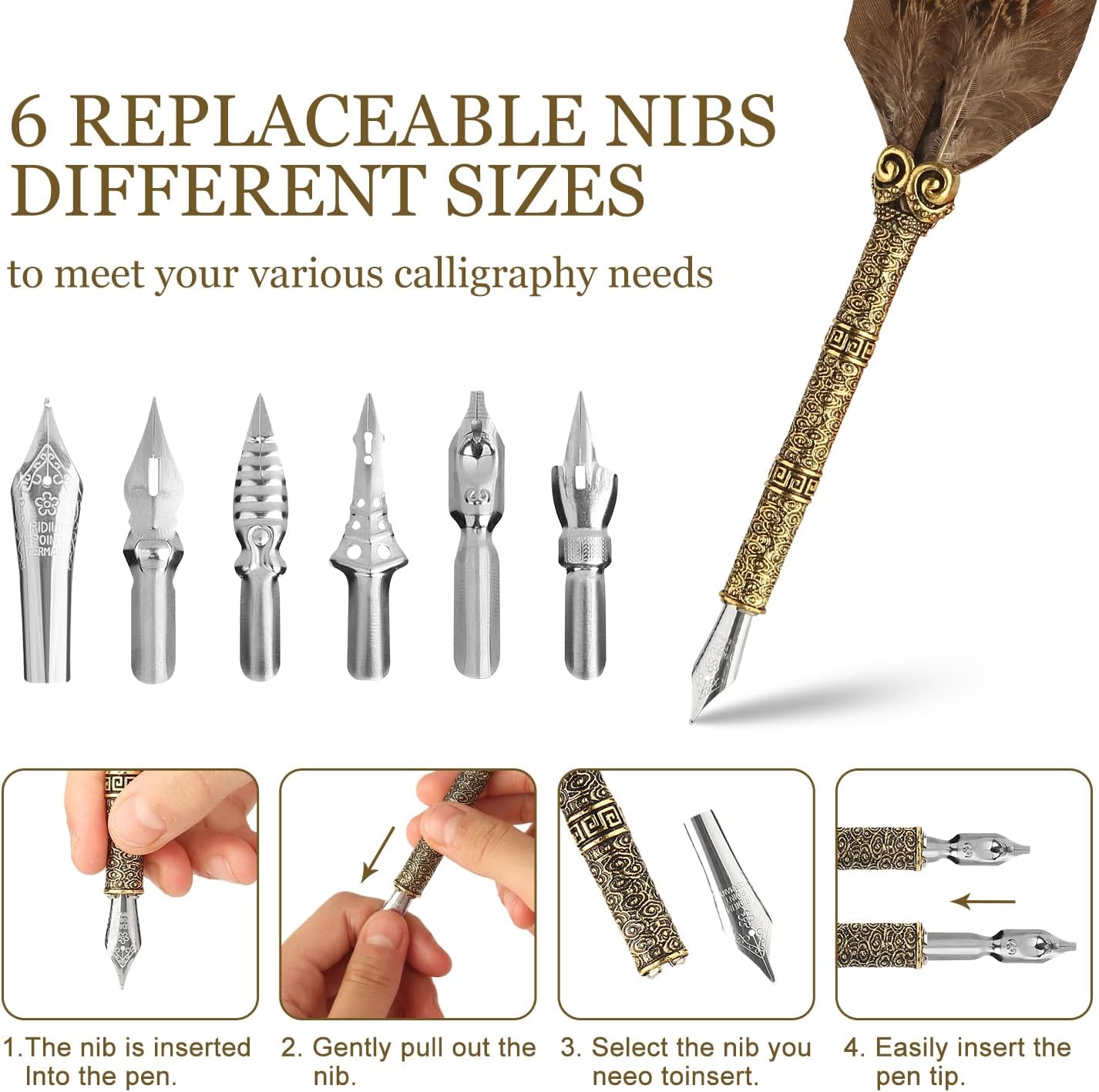 - 【Feather Quill Pen and Ink】Each handcrafted feather dip pen with sophisticated barrel patterns similar to Wukong’s constricting Headband is easy to hold. Every set contains 6 diverse pen nibs that can be interchangeable based on your preference. Easy to write by dipping pen nibs inside the black colored ink bottle. , resting the feather pen by placing it inside the pen base.