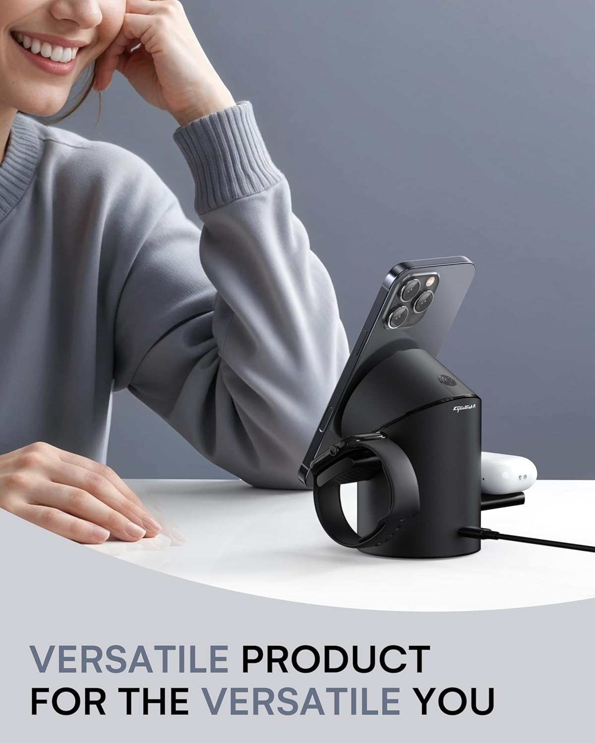- 3-in-1 Wireless Charging Station : Charge your iPhone, Apple Watch, and AirPods simultaneously on one sleek platform. The compact cylindrical design of the CylinTrick-R saves space while offering efficient wireless charging for all your Apple devices