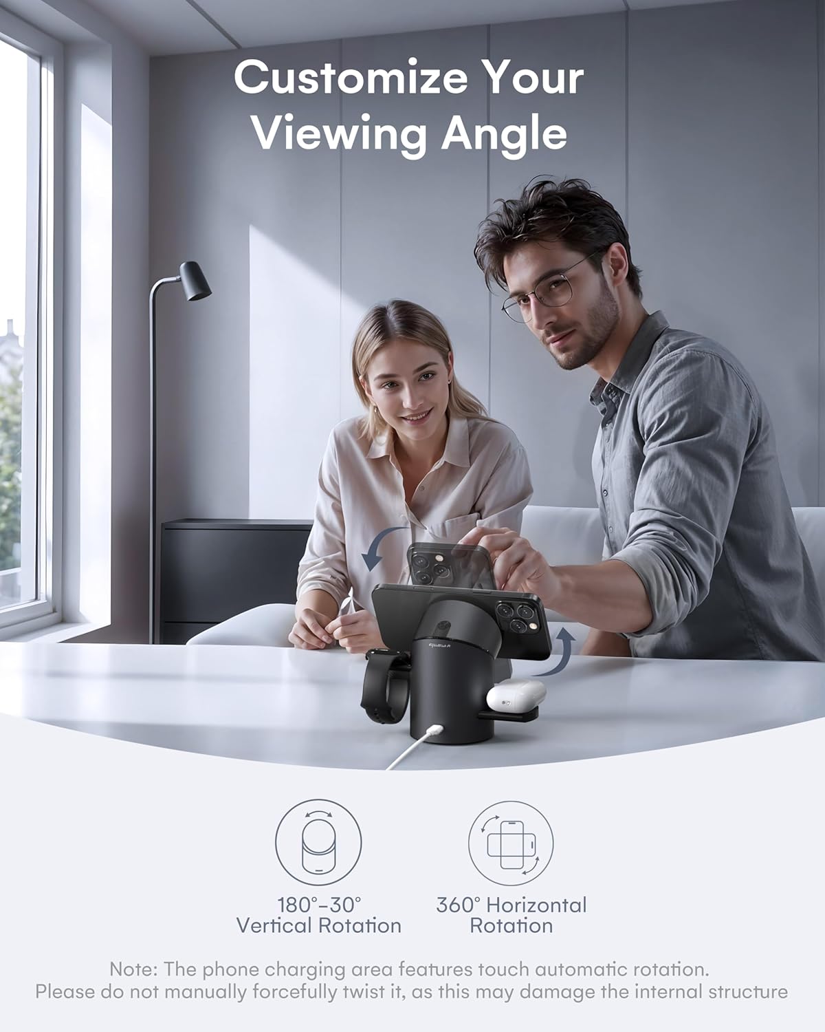 - Smart Touch Control: Experience effortless operation with this iPhone charging station featuring instant touch activation, The rotating phone charging area that doubles as a phone stand, allowing for easy viewing while charging. The charging docks for your AirPods and Apple Watch pop up with a press, saving space and keeping your setup organized when not in use.
