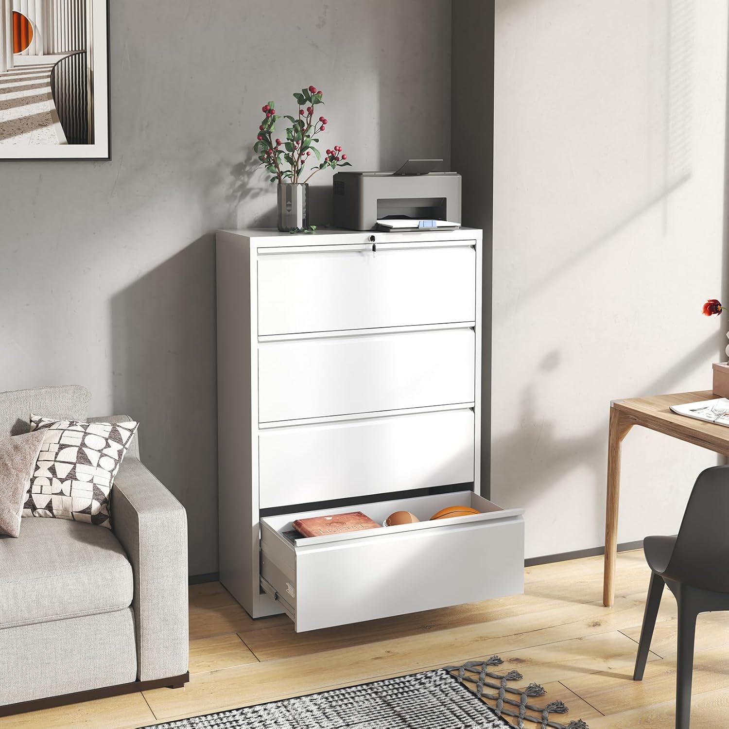 - 【Full Extension Drawers】 This premium office file cabinet features ball-bearing slides with full-extension capability, allowing drawers to open completely for full access to stored documents. It's an ideal choice for home offices, medical facilities, law firms, and any environment requiring reliable document protection and user safety.