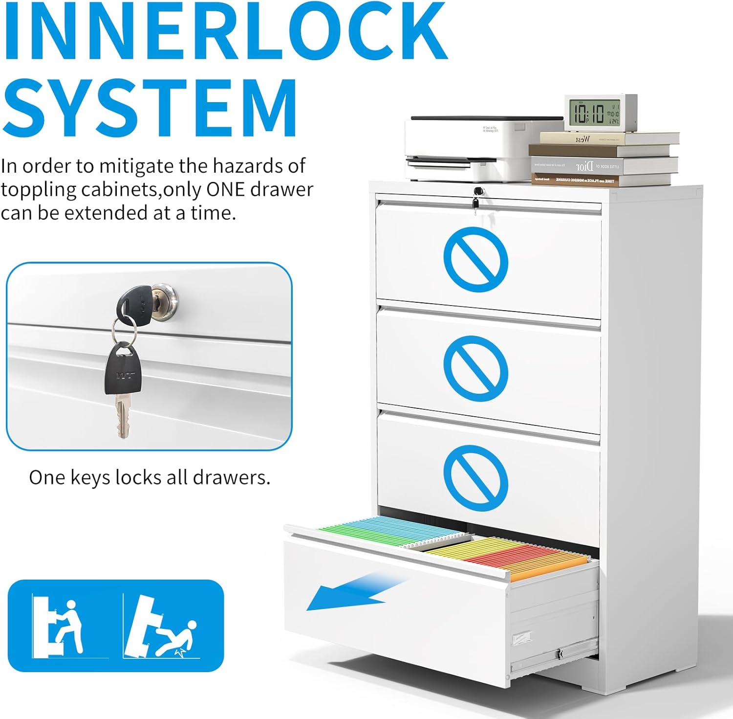 - 【Enhanced Security and Safety】This filing cabinets for home office has an interlocking mechanism that locks all the drawers, allowing only one drawer to open at a time to add security. Additionally, the anti-tilt device also enhances safety further by fixing the metal filing cabinet to the wall.