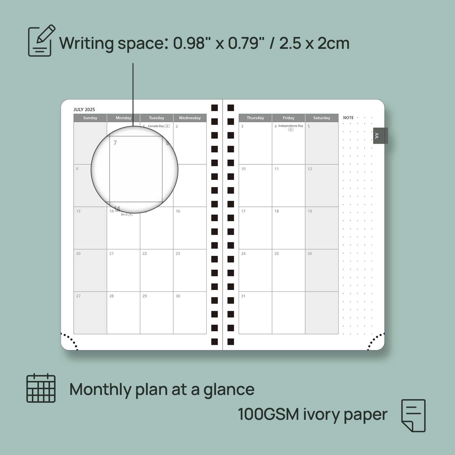 - EXTRA FUNCTION PAGES - Includes a 2025-2026 Yearly Overview, Holiday & Calendar, Monthly Expenses, Contact & Password pages, and 7 dotted notes pages for detailed jotting.