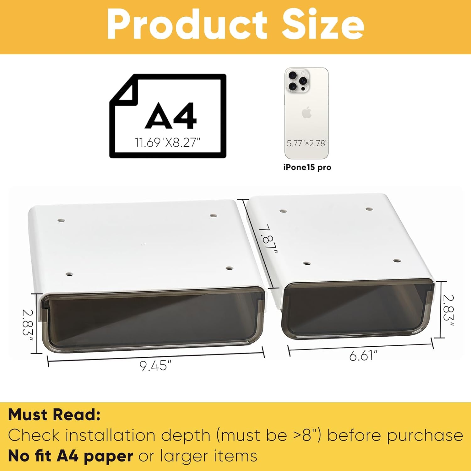 - 【EASY INSTALLATION】This under desk drawer organizer is easy to install with self-adhesive strips and pre-drilled holes for screws. Ideal for under table storage, offering flexible setup without tools or drilling