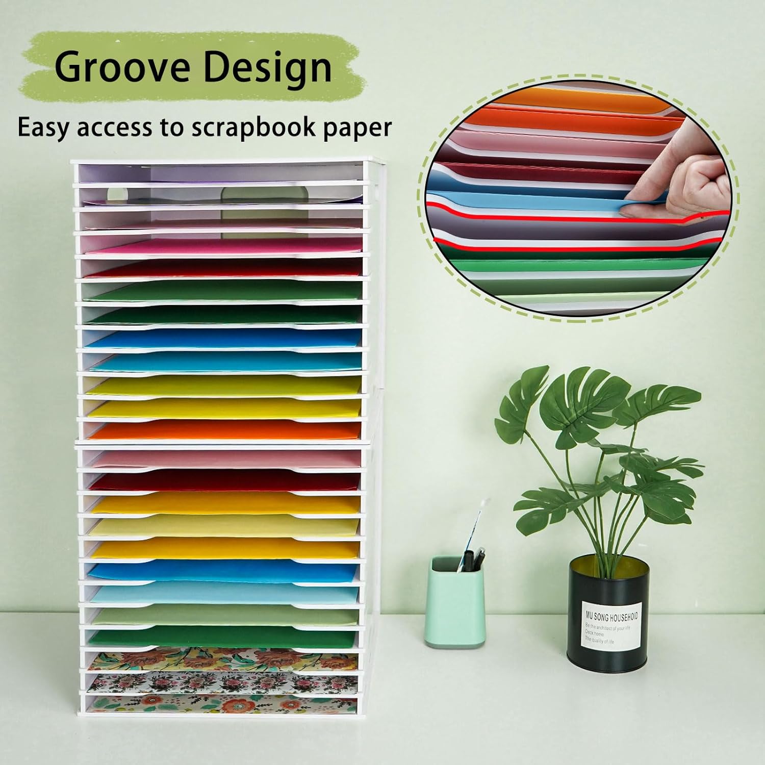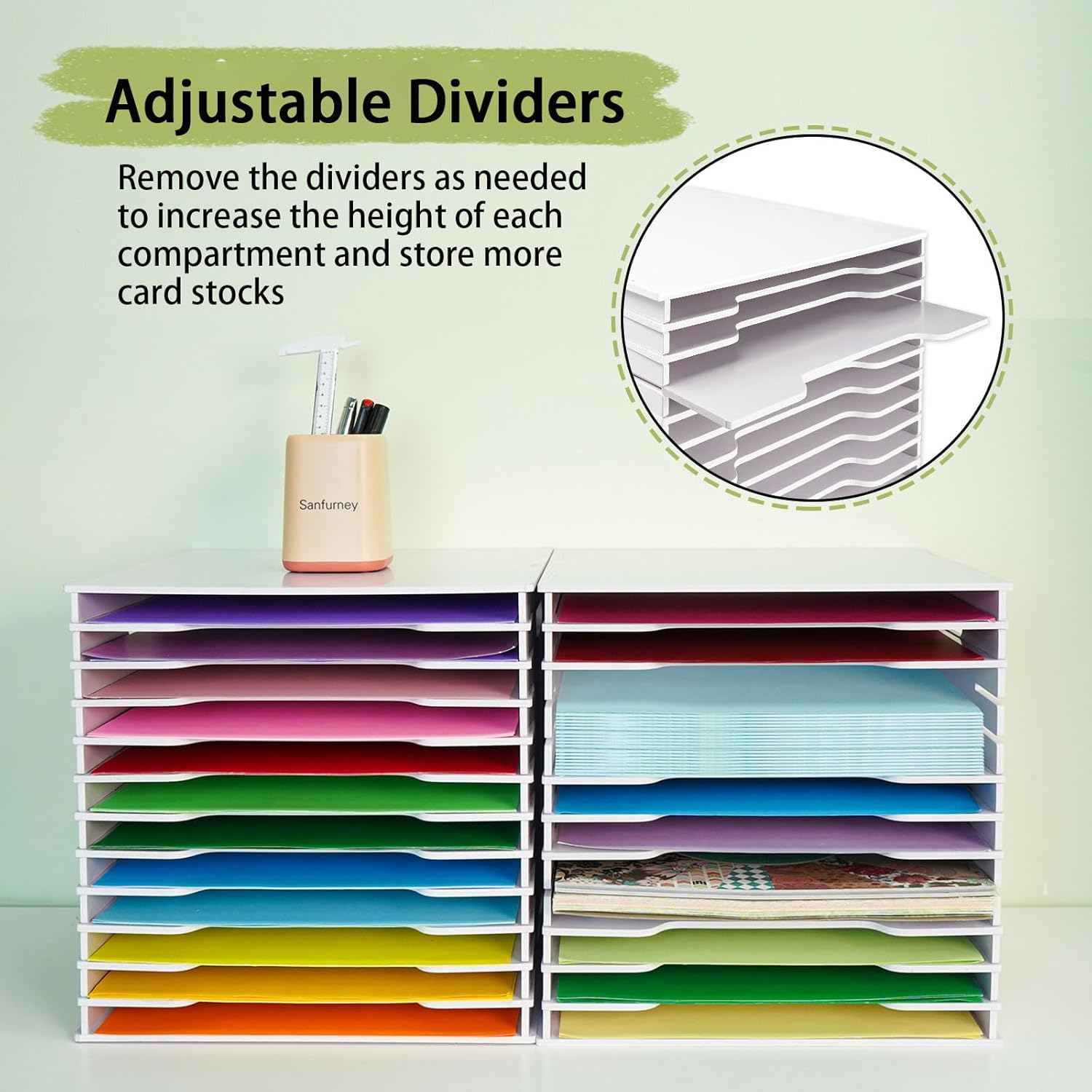- Adjustable Layer Heights - The scrapbook paper rack has adjustable dividers, allowing you to adjust the height of each layer to accommodate different crafting materials and supplies. Tailor your storage to your needs and enjoy the flexibility our rack offers for your creative projects