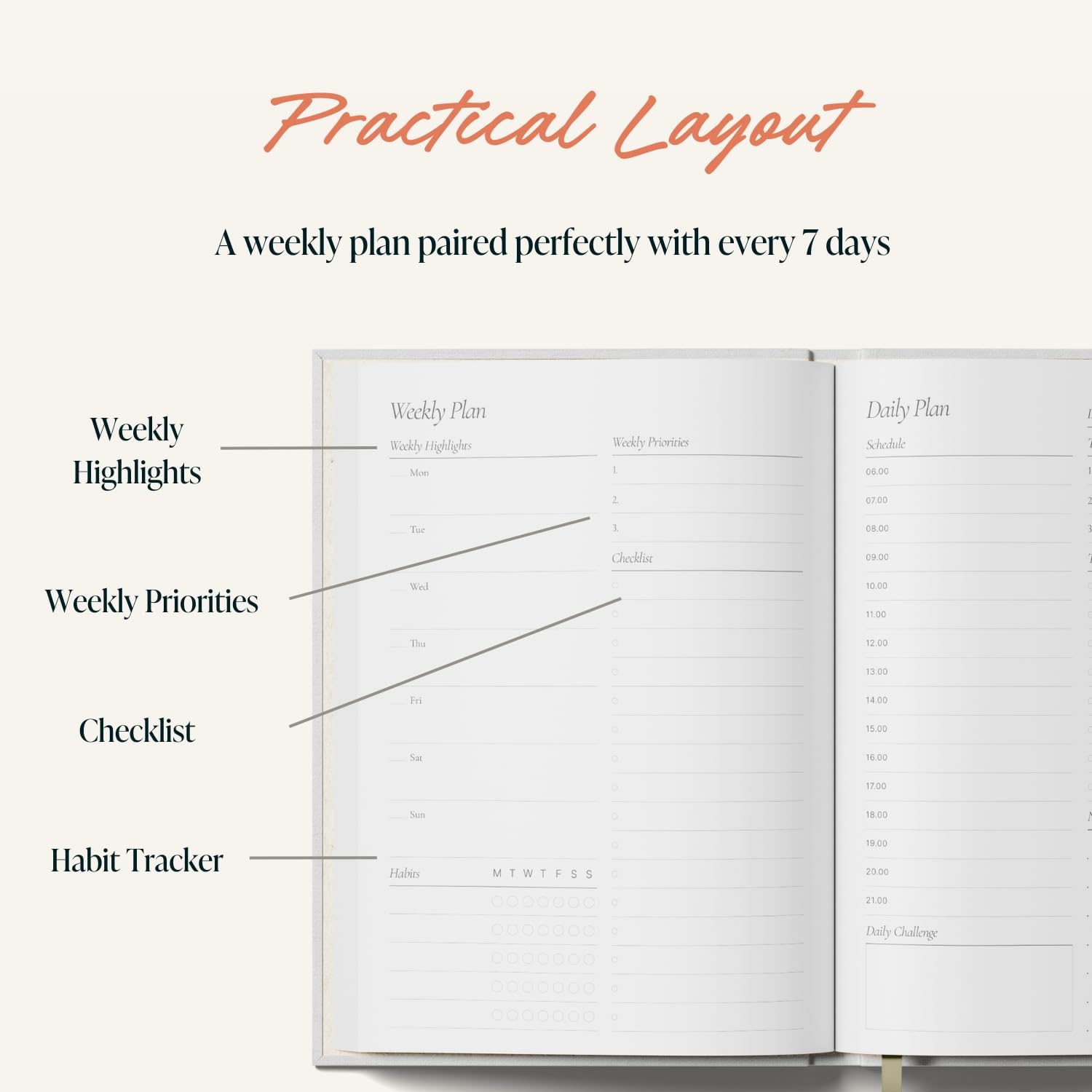 - Comprehensive daily schedule from 6 AM to 9 PM. Also includes weekly planner pages.