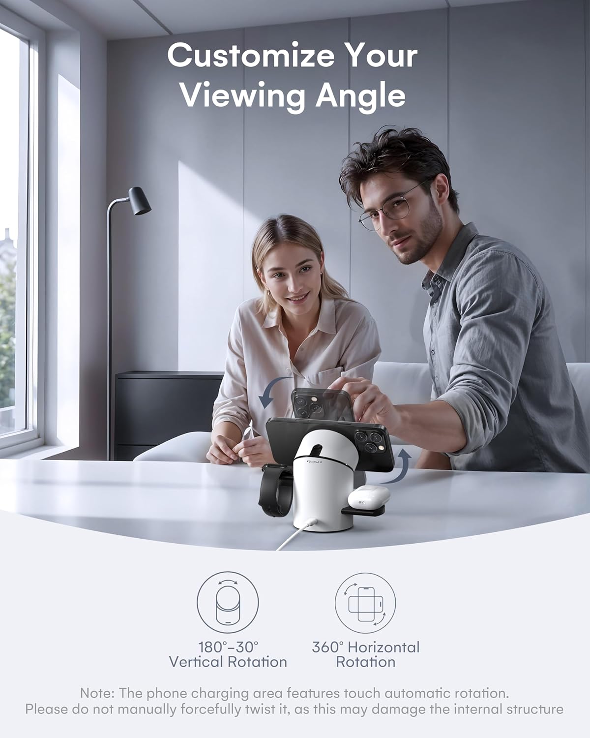- Smart Touch Control: Experience effortless operation with this iPhone charging station featuring instant touch activation, The rotating phone charging area that doubles as a phone stand, allowing for easy viewing while charging. The charging docks for your AirPods and Apple Watch pop up with a press, saving space and keeping your setup organized when not in use.