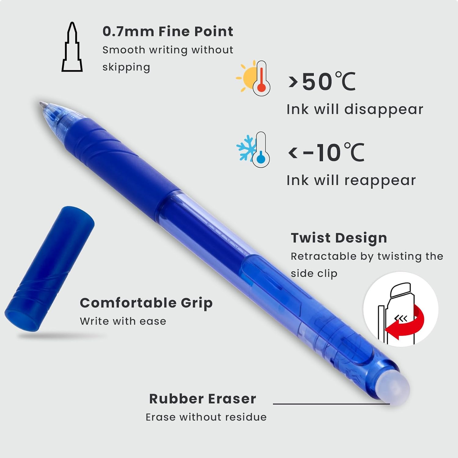 - 12 Blue, Twist Design: 12 blue pens with 0.7 mm fine point tip; Smooth writing gel ink: nontoxic, acid-free, non-bleeding, heat erasable; Eraser is on the top of the pen; the pen is retractable by twisting the side clip