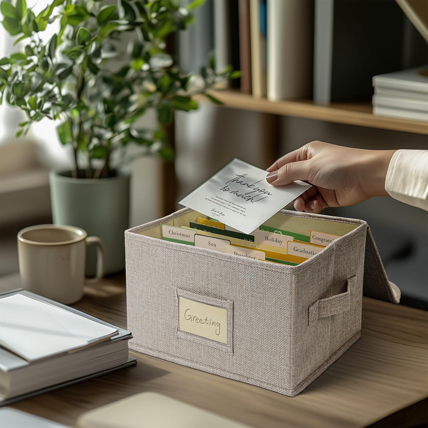 Vienrose Greeting Card Organizer Storage Box with 20 Removable Dividers, 84 Self-stick Labels, Perfect for Photos, Envelopes, Scrapbooking, Paper, Stickers Holder 2 Pack Beige