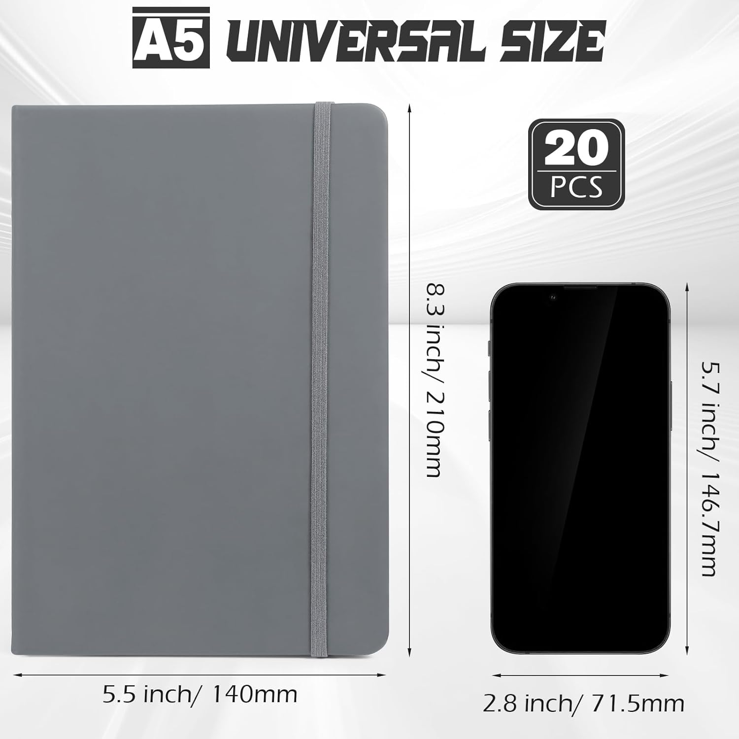 Honoson 20 Pack Lined Journal Notebooks A5 Hardcover Executive Notebook 5.5" x 8.3" PU Leather Wide Ruled Journals Bulk with Elastic Band for Home Business Office School Supplies(Gray)