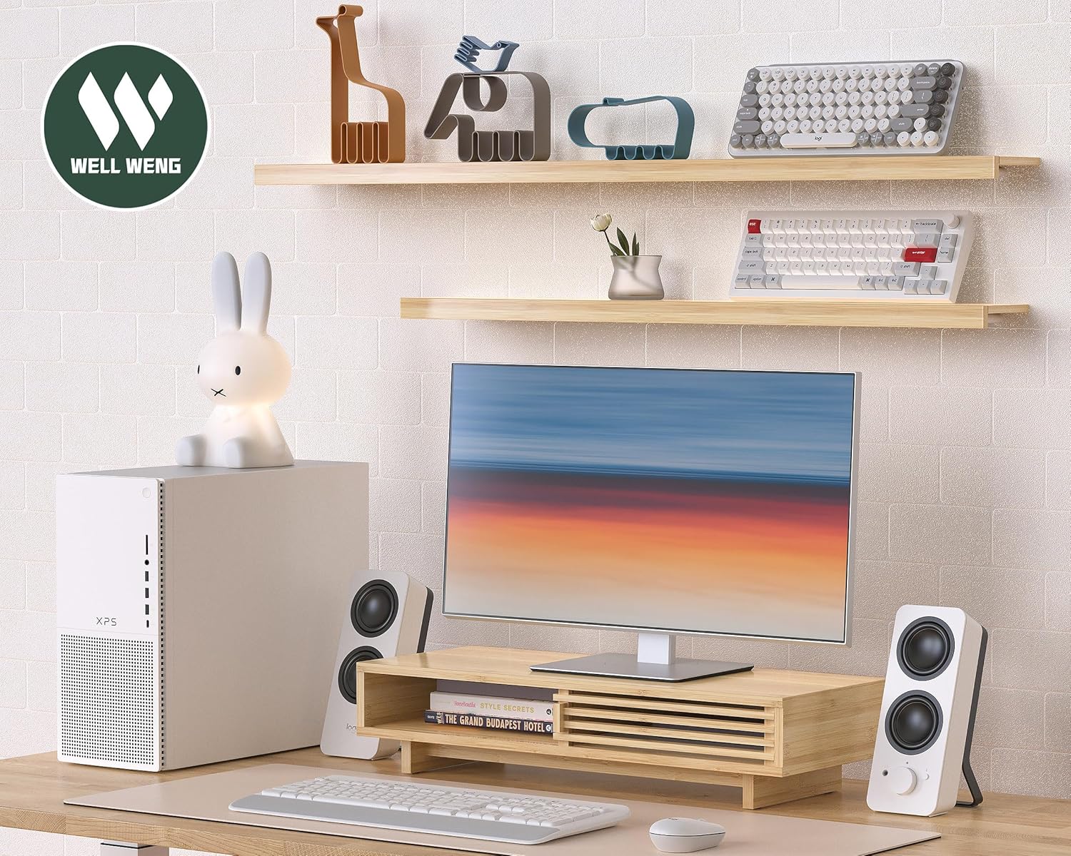 Monitor Stand Riser with Sliding Door, Computer Laptop Stand Desk Shelf Organizer with Storage (Natural Bamboo, 25 Inch)