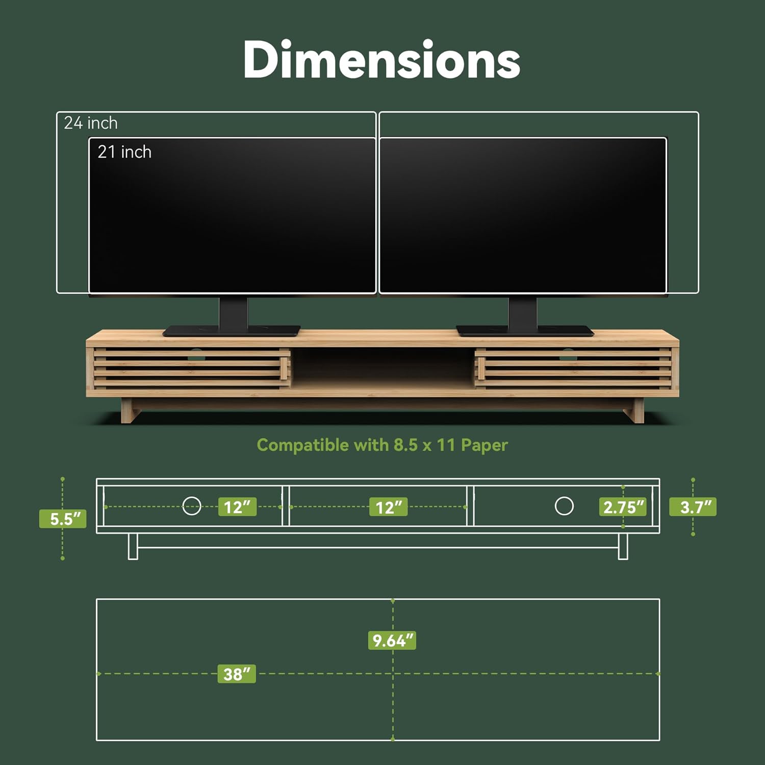 Dual Monitor Stand Riser with Sliding Door, Double Computer Laptop Stand Desk Shelf Organizer with Storage (Natural Bamboo, 38 Inch)