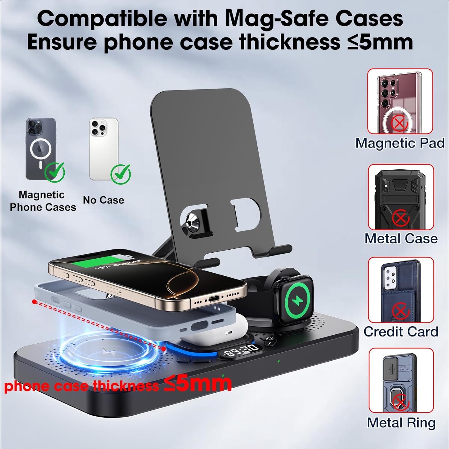 - [Smart Charging with Multiple Protections] Designed with advanced safety features, this charging station includes over-current protection, over-voltage protection, and foreign object detection. It provides comprehensive protection for your electronics. Tip: For optimal performance, remove phone cases thicker than 5mm, magnets, or metal accessories before charging.