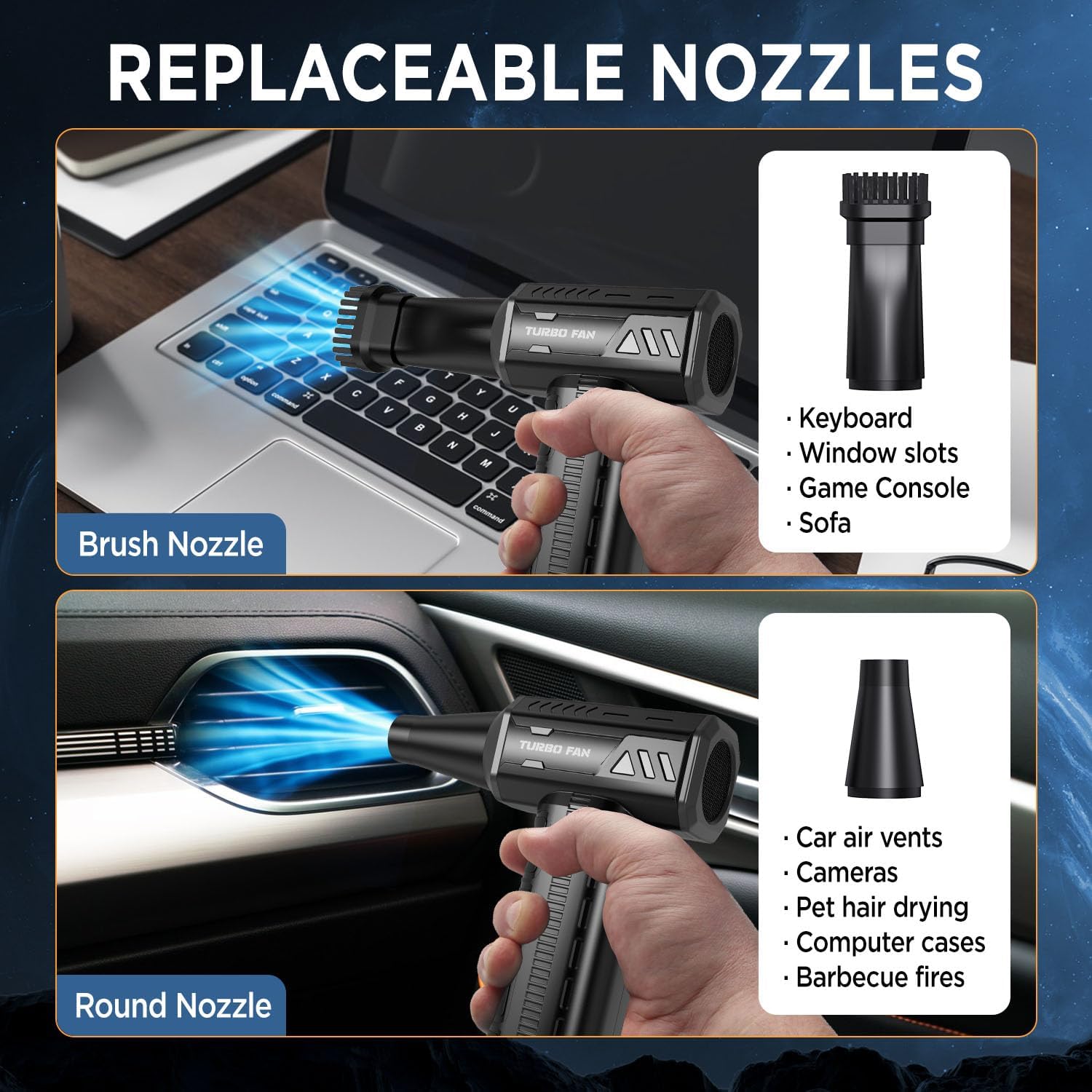 - 【Suitable for Varieties of Occasions】Two types of nozzles are included for a wide range of applications. The nozzle at the tip can be replaced. Cordless, high power, can be used anywhere indoors or outdoors,such as keyboard crevices, barbecue or picnic, around computers, pet hair removal, air conditioners, pollen, fire starting, inside cars, sofas, window sills, and splattering drops after car washes.