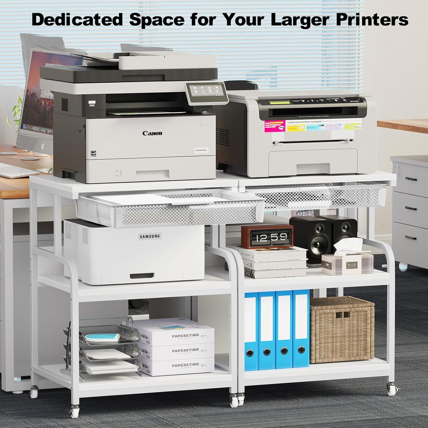 - Drawer Basket: The printer stand with drawer basket offers a dedicated space to store office supplies, such as paper, ink cartridges, cables, or other printer accessories. It allows you to keep these items within reach, reducing clutter on the desk or workspace.
