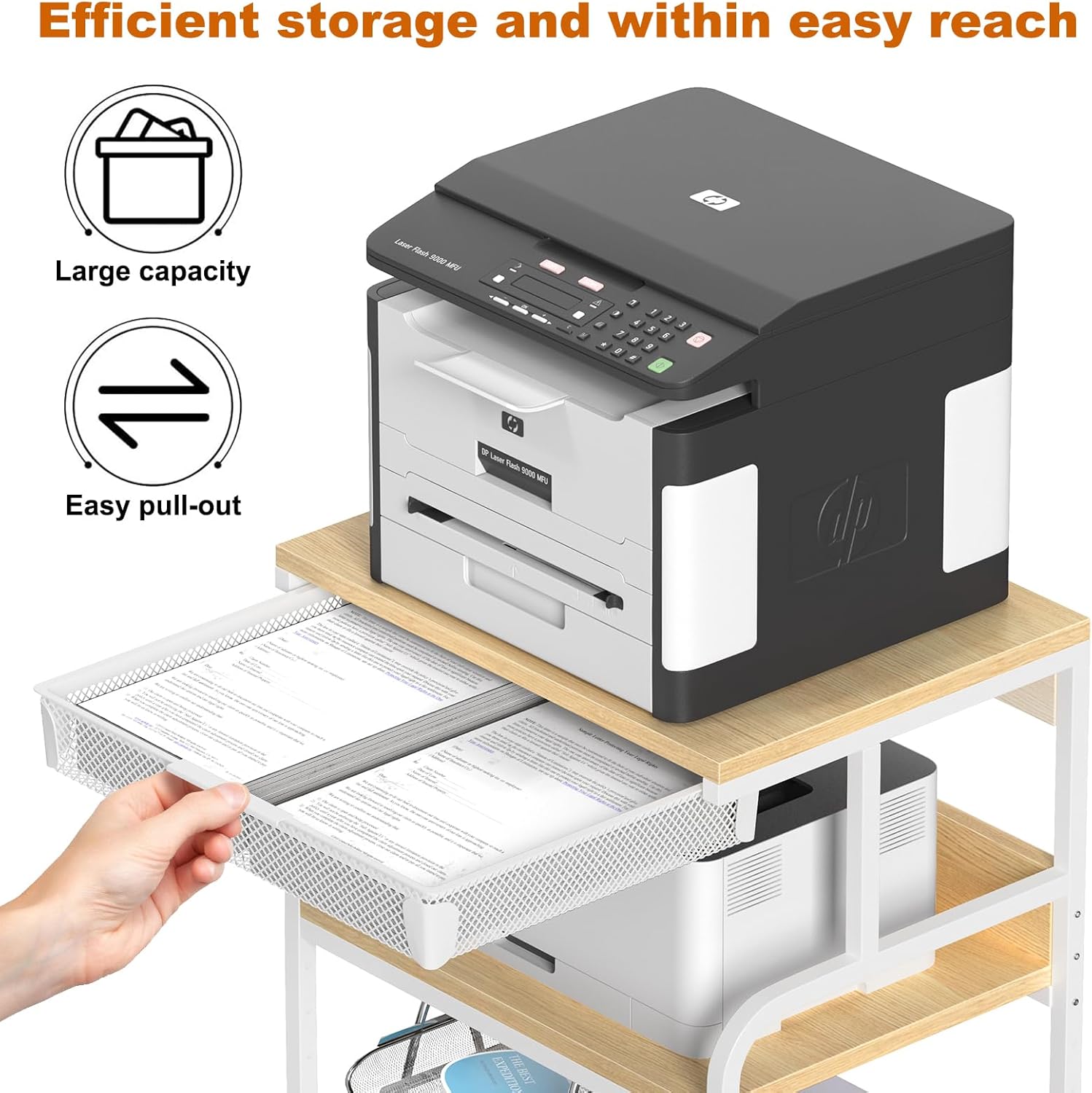 - Drawer Basket: The printer stand with drawer basket offers a dedicated space to store office supplies, such as paper, ink cartridges, cables, or other printer accessories. It allows you to keep these items within reach, reducing clutter on the desk or workspace.