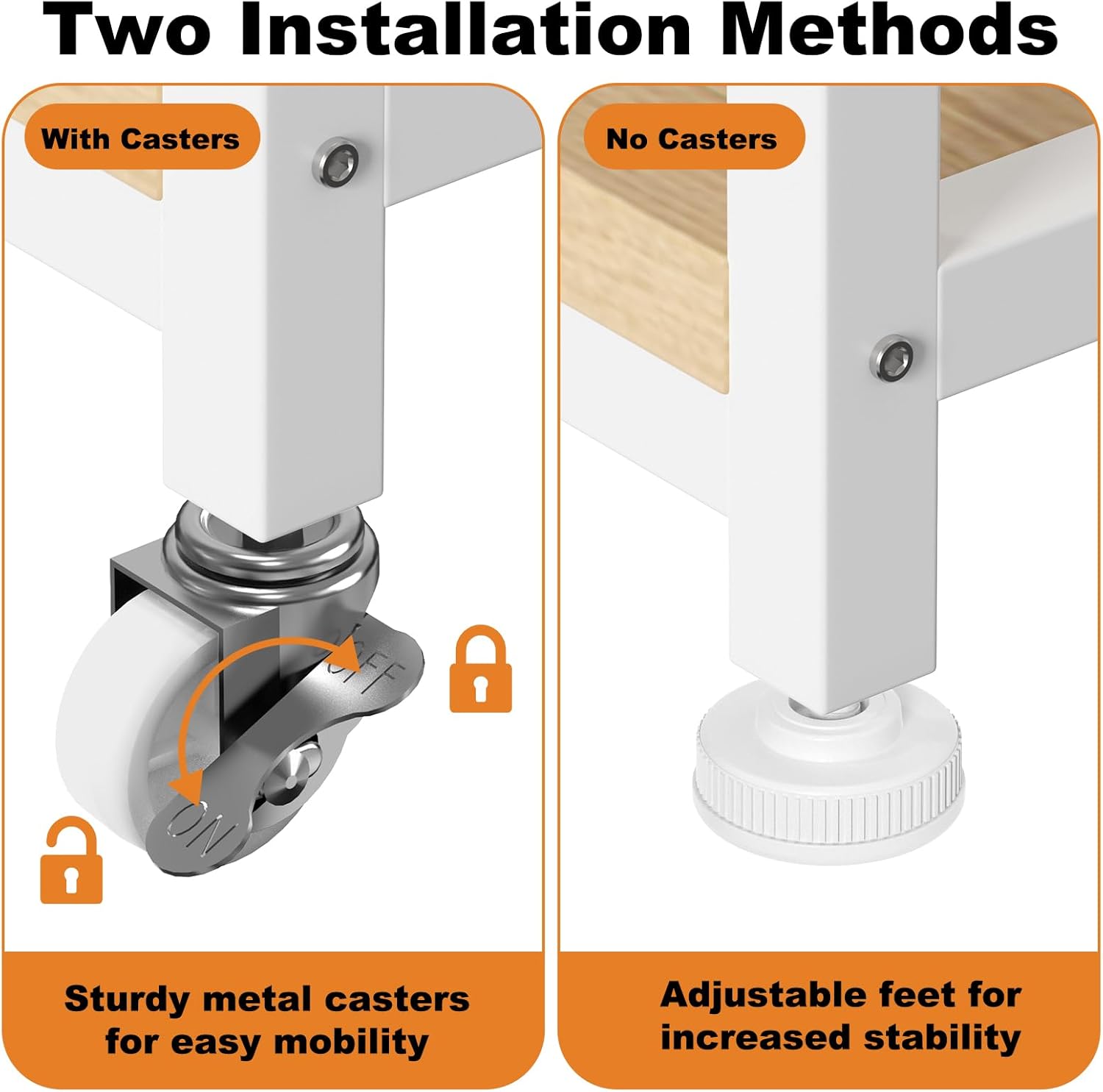 - Two Installation Options: The printer table can be used with or without wheels.Not only does it make it easy to move the printer around without having to manually lift it, but it also makes it easy to clean underneath the printer stand.