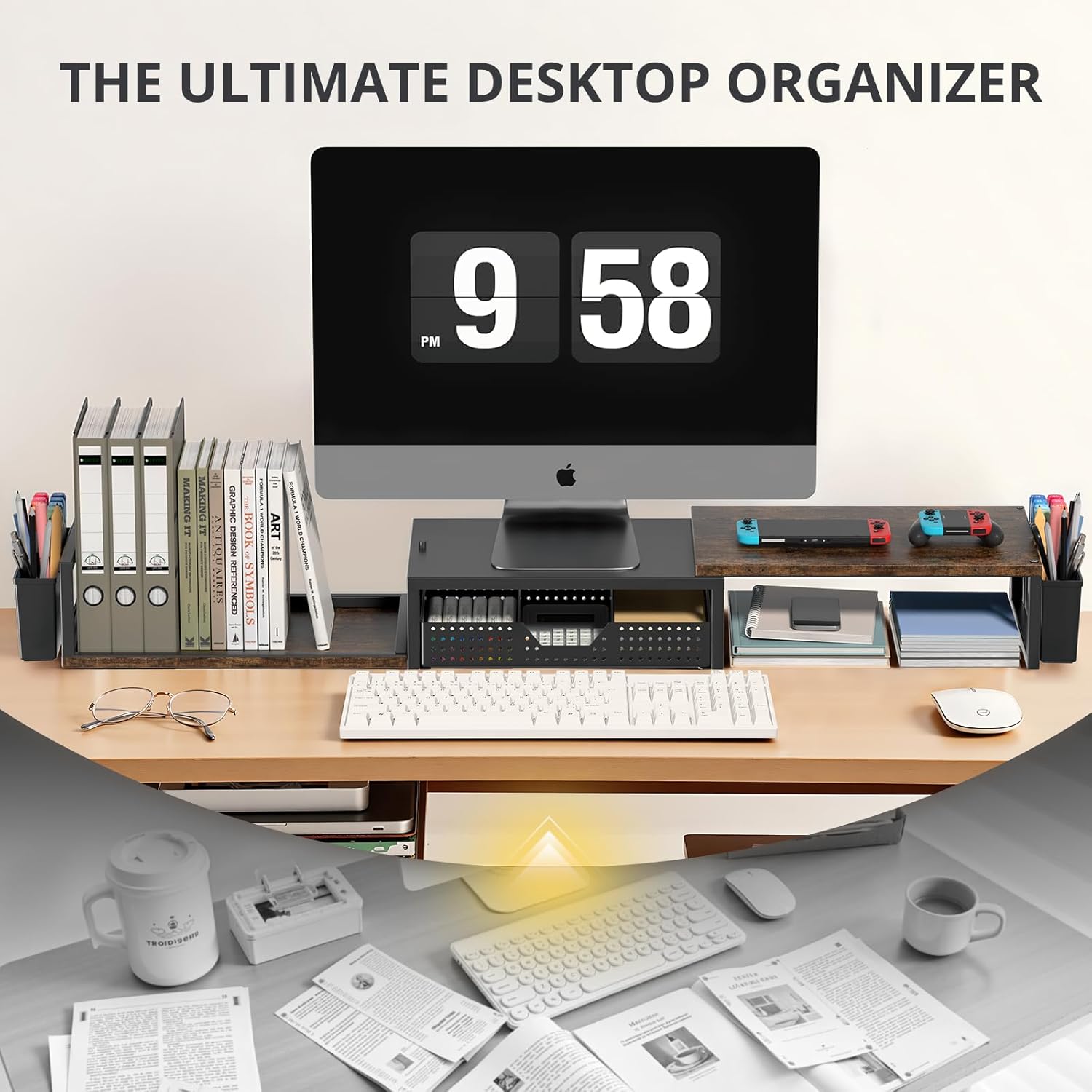 - 【Strong & Stylish】Premium metal and retro wooden board construction ensures rock-solid stability for heavy daily use. Our sleek monitor stand for desk blends aesthetics with functionality, transforming clutter into calm. Elevate your workspace organization for a more enjoyable workday