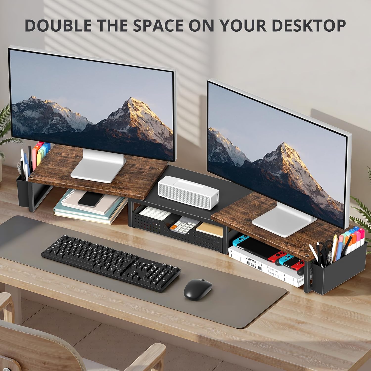 Desk Dual Monitor Stand Riser - Desk Organizer with Drawer and Pen Holders, Office Desk Accessories & Workspace Organization, Computer Monitor Stand for Laptop, Printer, TV, Office Decor, Wood