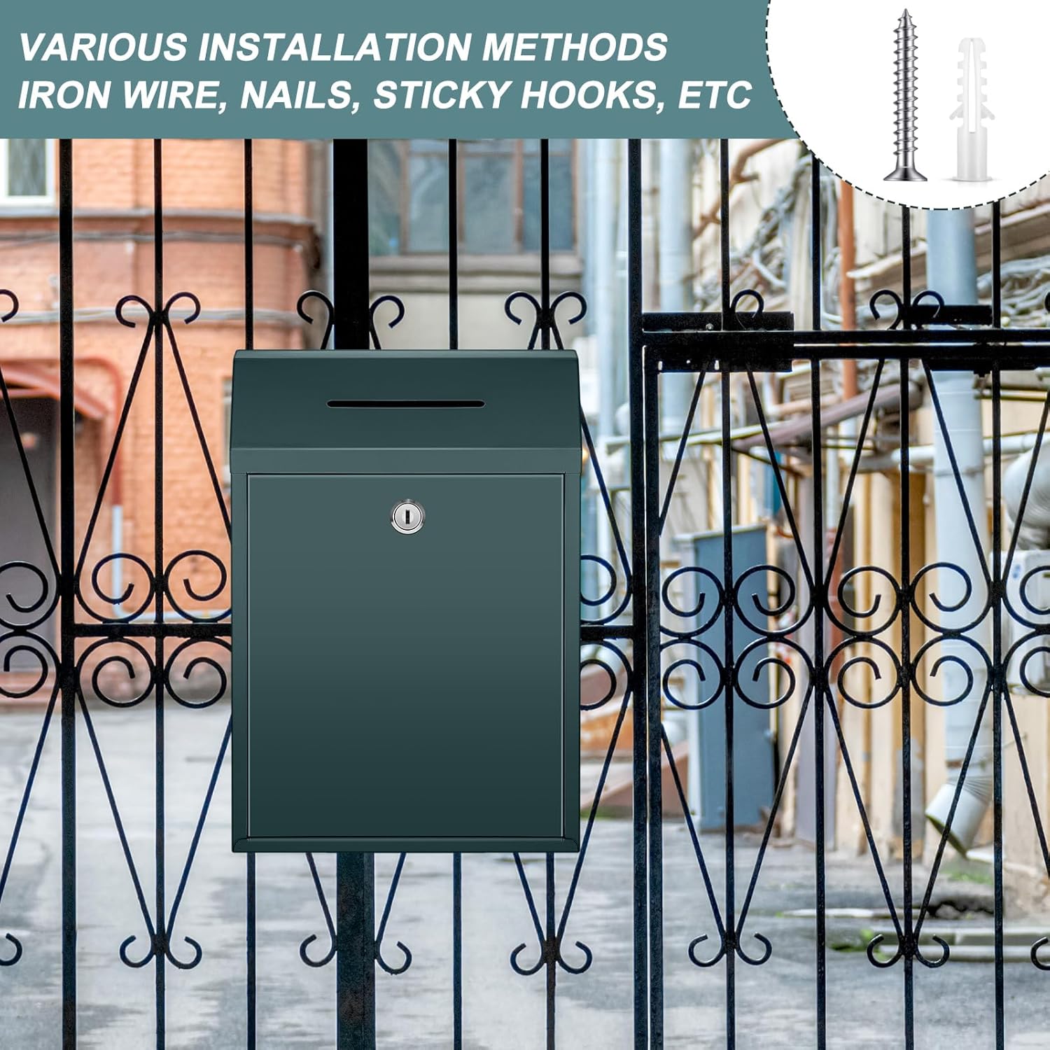 - Delicate Design: the top of our mailbox wall mounted outdoor is designed with a rainproof cover, which can effectively prevent rain from entering the mailbox; There is a small square mouth under the cover, which can facilitate your daily delivery of letters and other items; The keyhole design of the product is on the front, which can facilitate you to take out the items in the mailbox at any time