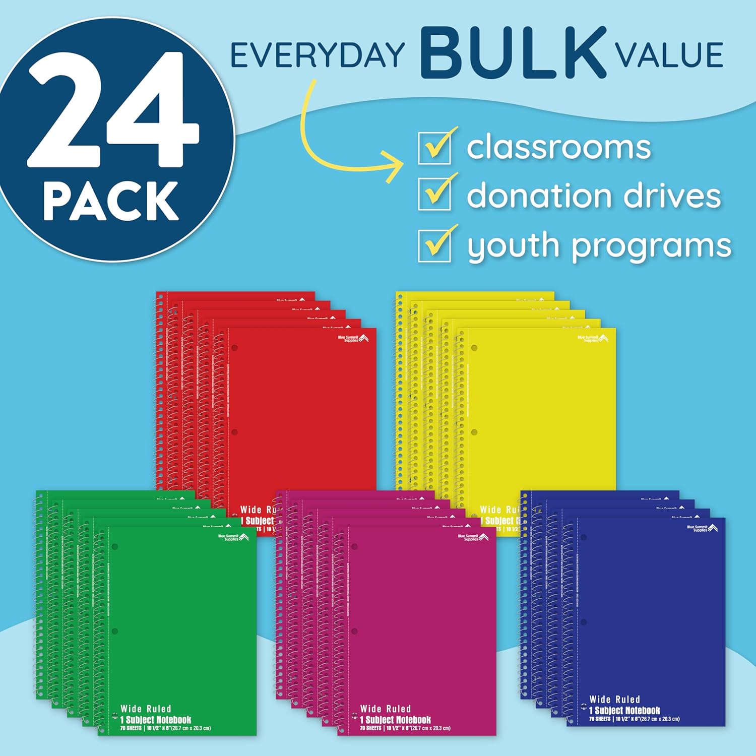 - Versatile 1 Subject Notebooks โ This 24 pack of 1 subject notebook wide ruled includes 70 sheets per book, perfect for school notebooks, journaling, office projects, or donation drives.