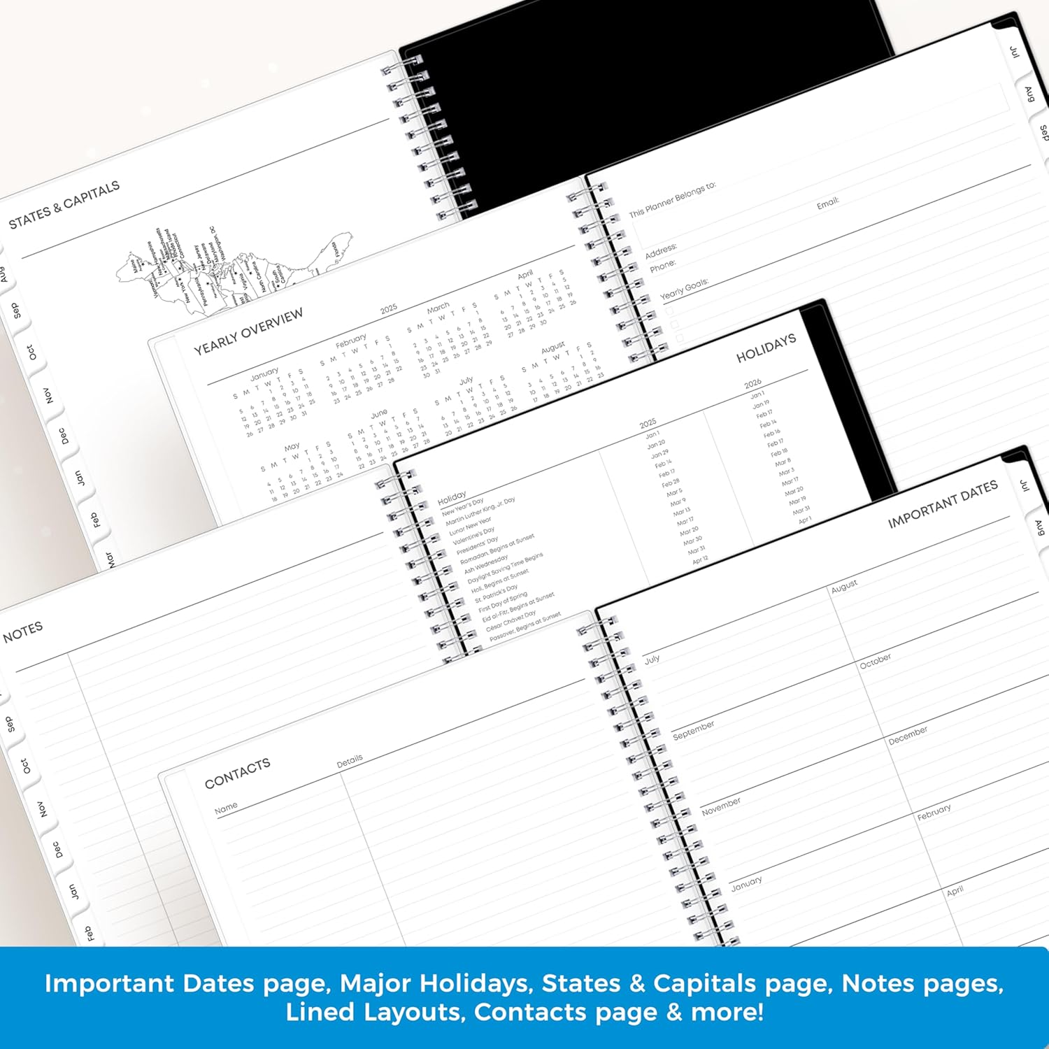 - [YEARLY OVERVIEW] Yearly calendar planner includes a convenient list of holidays, reference calendars, contacts pages and extra notes pages to accommodate your scheduling needs