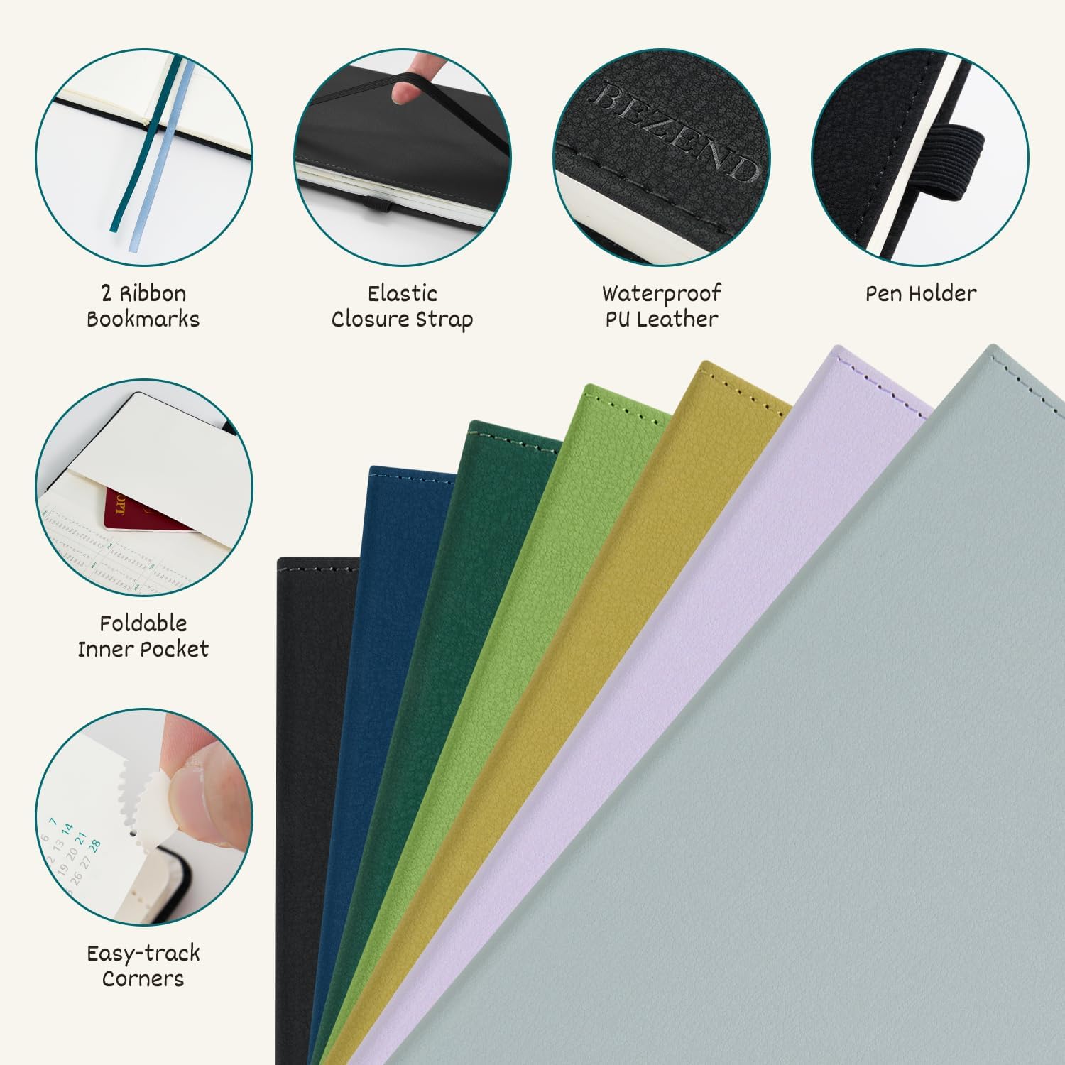 - THOUGHTFUL DESIGN: 2 Ribbon Bookmarks | Easy-track Perforated Corners | Elastic Closure Strap | Inner Storage Pocket | Pen Loop | Date Countdown | Monthly Label