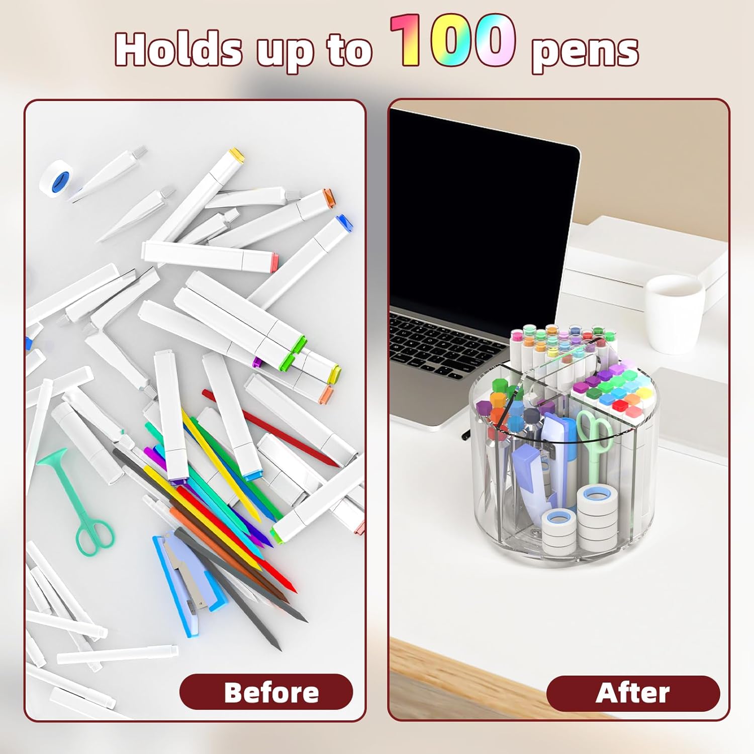 - 360 Degree Rotating Desktop Organizer -This organizer with 360 degree rotating designed, can not only organize pens and pencils, but also makeup brushes and lipsticks.This acrylic desk organizer making your tabletop look more advanced. Our pen organizers can be spins both sides, which is very convenient for storing pens and craft supplies, and it is easy to find and take the items we need by gently rotating it.