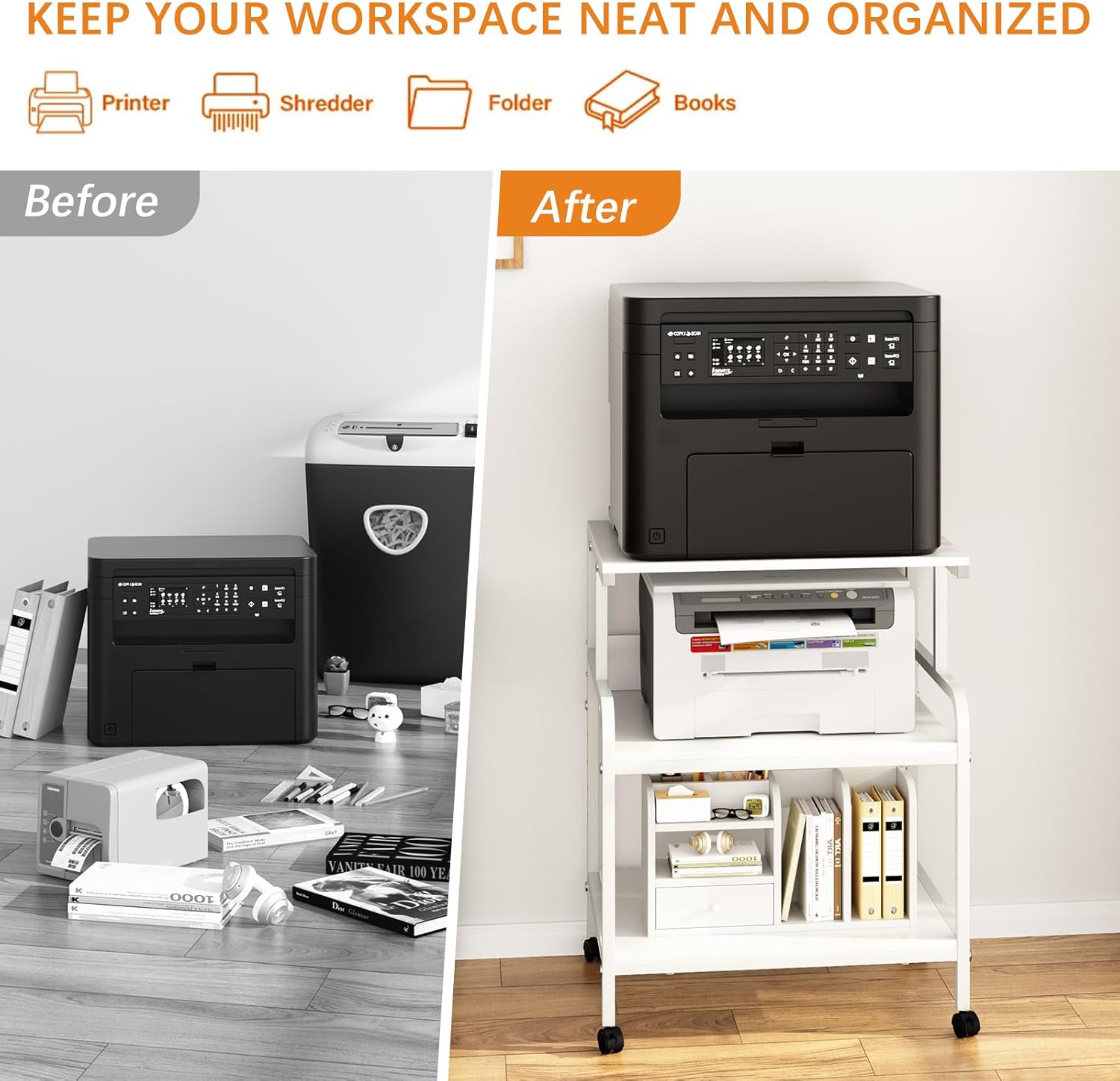- 【Easy Assembly】:This well-designed home printer stands is easy to assemble. The package comes with an installation manual and a full set of installation tools, through which you can install it in 20 minutes. Before long, you'll have the perfect storage shelf!