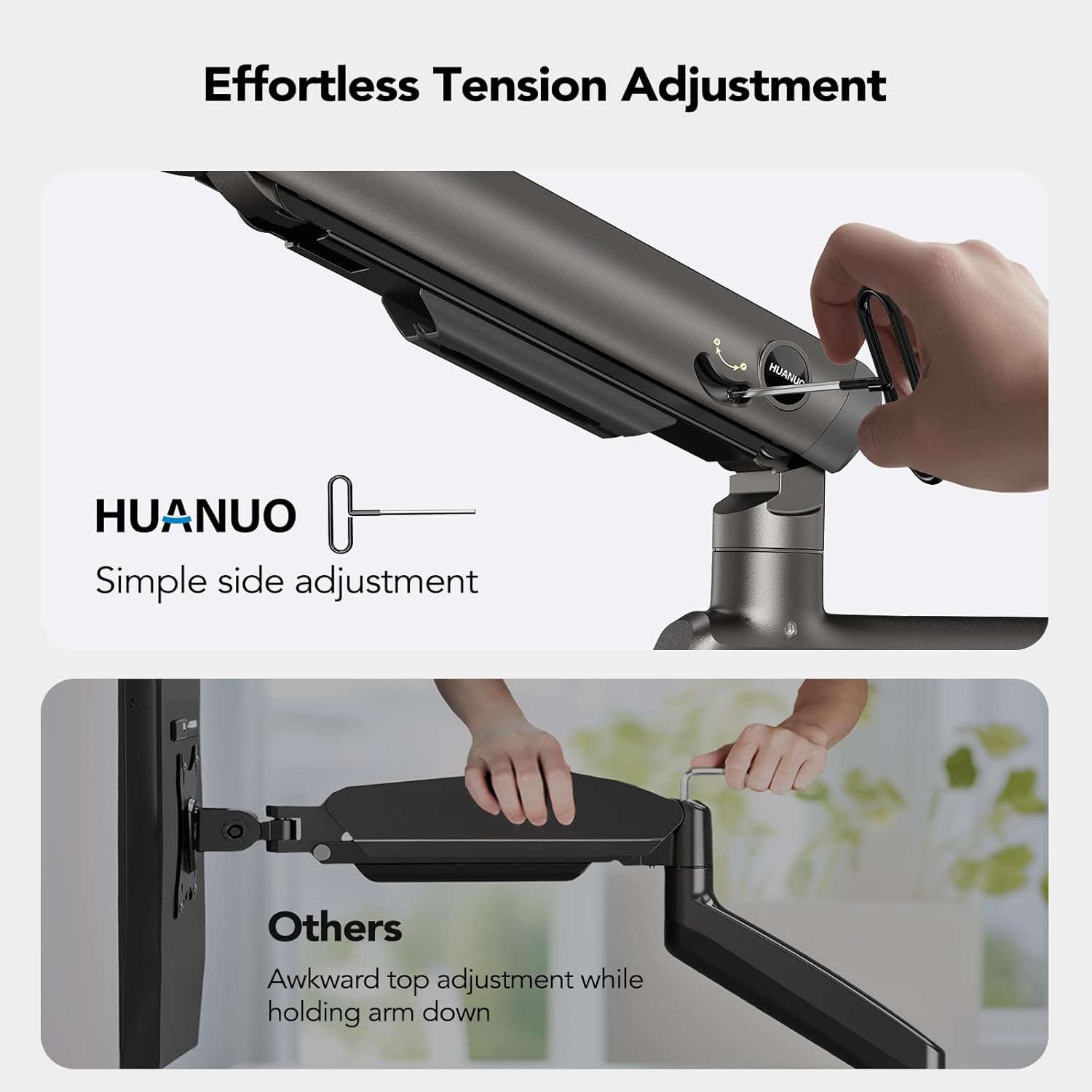 - Easy Setup and Adjustments: Set up your monitor desk mount in minutes, thanks to the quick-install VESA plate, clearly labeled parts, and step-by-step instructions. HUANUO computer monitor armβs side tension adjustments are simple with one-hand operation β with nothing awkward to adjust at the top. Just use the included Allen key to easily fine-tune to your desired tension.