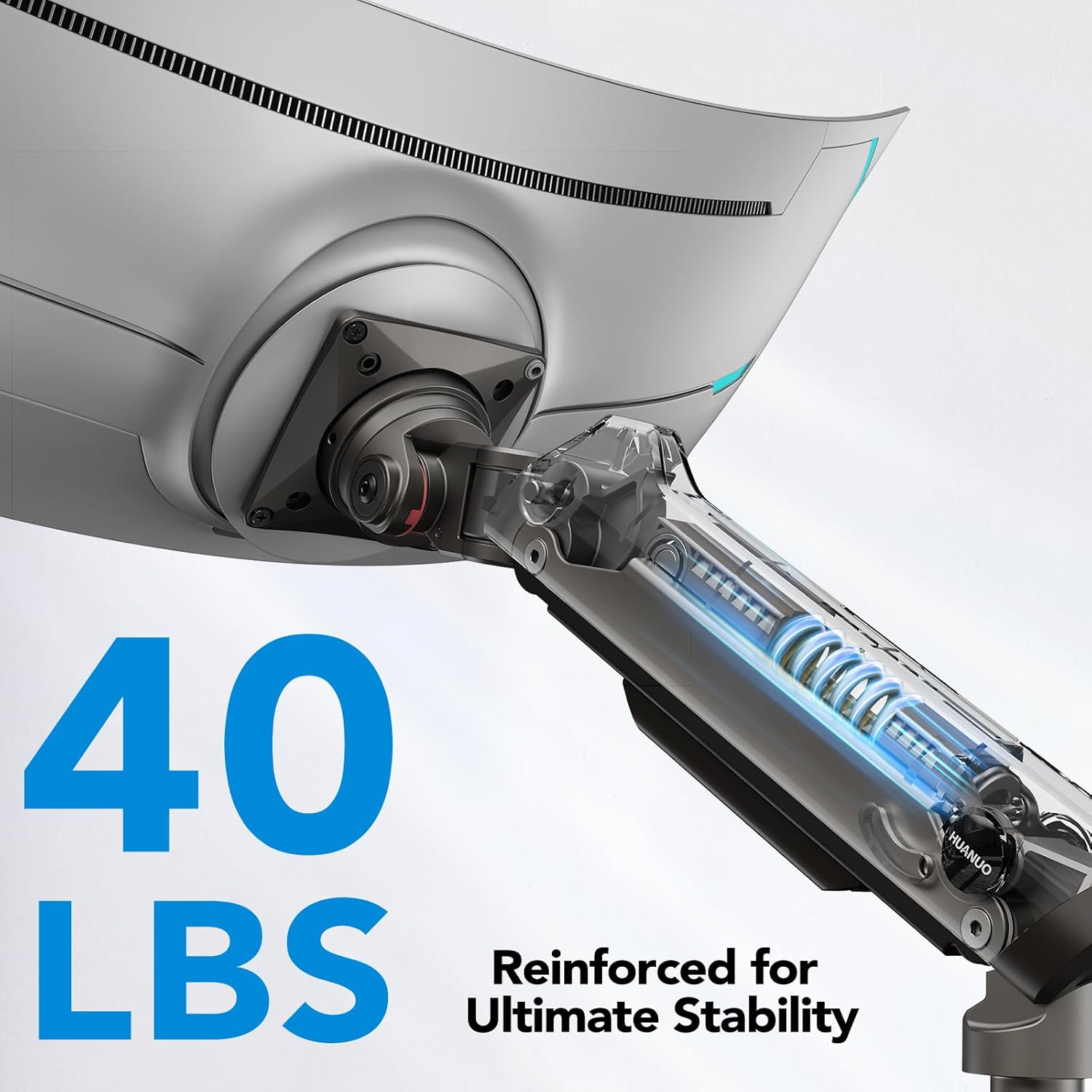 - Durable and Dependable: This HUANUO dual monitor arm is constructed in high-strength aluminum alloy, and features a reinforced VESA head, lock ring, and 20% thicker arms for ultimate stability. Supporting monitors up to 40 lbs, it has passed rigorous testing, including 50,000 cycle motion tests and a 3X load test. So it'll keep your monitor securely in place for years.