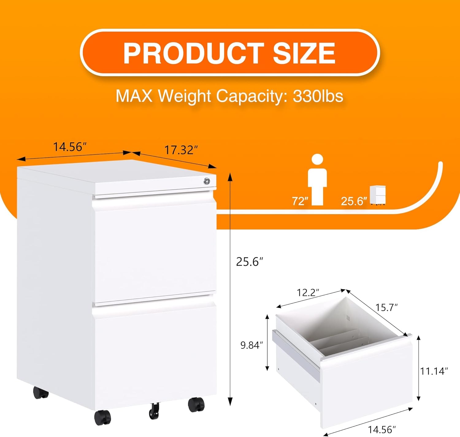 Aobabo Metal 2 Drawer Office File Cabinet with Lock, Under Desk Office Steel Files Cabinet on Wheels, 25.6''H Legal/Letter A4 Size, Fully Assembled Except Wheels,White