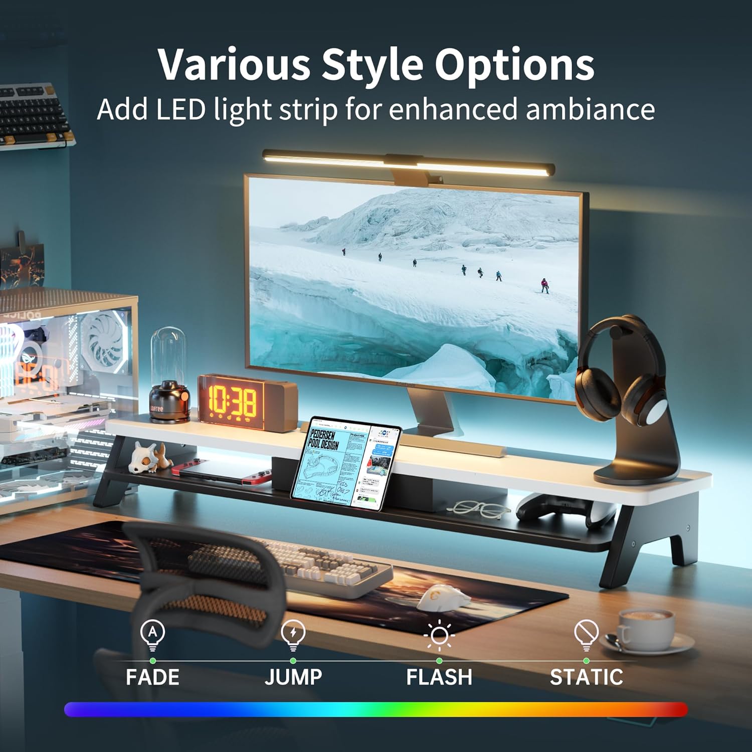 - LED Light Strip:Featuring an integrated LED light strip, this riser adds a soft, ambient glow to your workspace. It not only enhances your desk lighting but also creates a modern, stylish atmosphere, perfect for both work and relaxation.