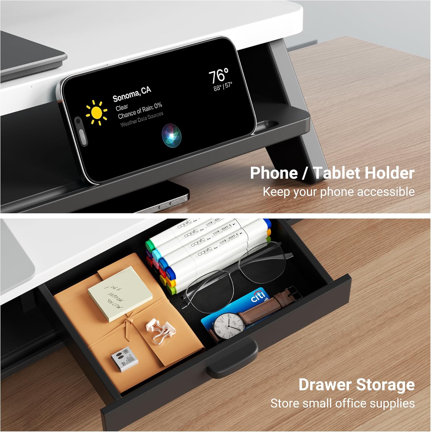 - Dual-Tier Storage:This monitor riser features a practical 2-tier design, providing extra storage space. The top tier securely holds your monitors, while the lower tier is perfect for storing keyboards, files, pens, and other office supplies. Additionally, the riser includes a convenient phone/tablet holder and a drawer, helping you keep your desk organized and clutter-free.
