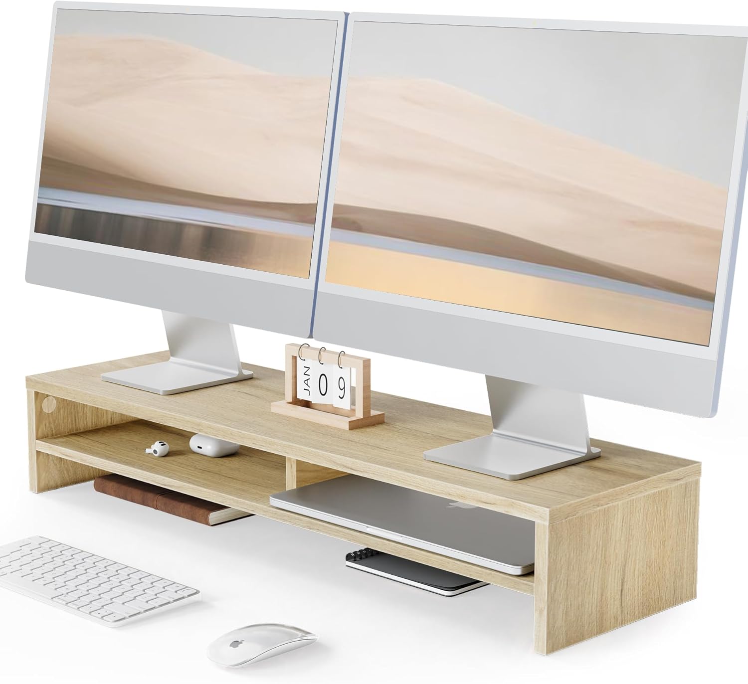 - 【Desk Shelf Organizer】Dimensions: 31.5"x 9.3"x 5.6", designed for monitor setups, this dual monitor stand features 2-tier structure and 2 open compartments to manage cables. Tame your desk chaos: store notebooks, pads, and even a mini plant!