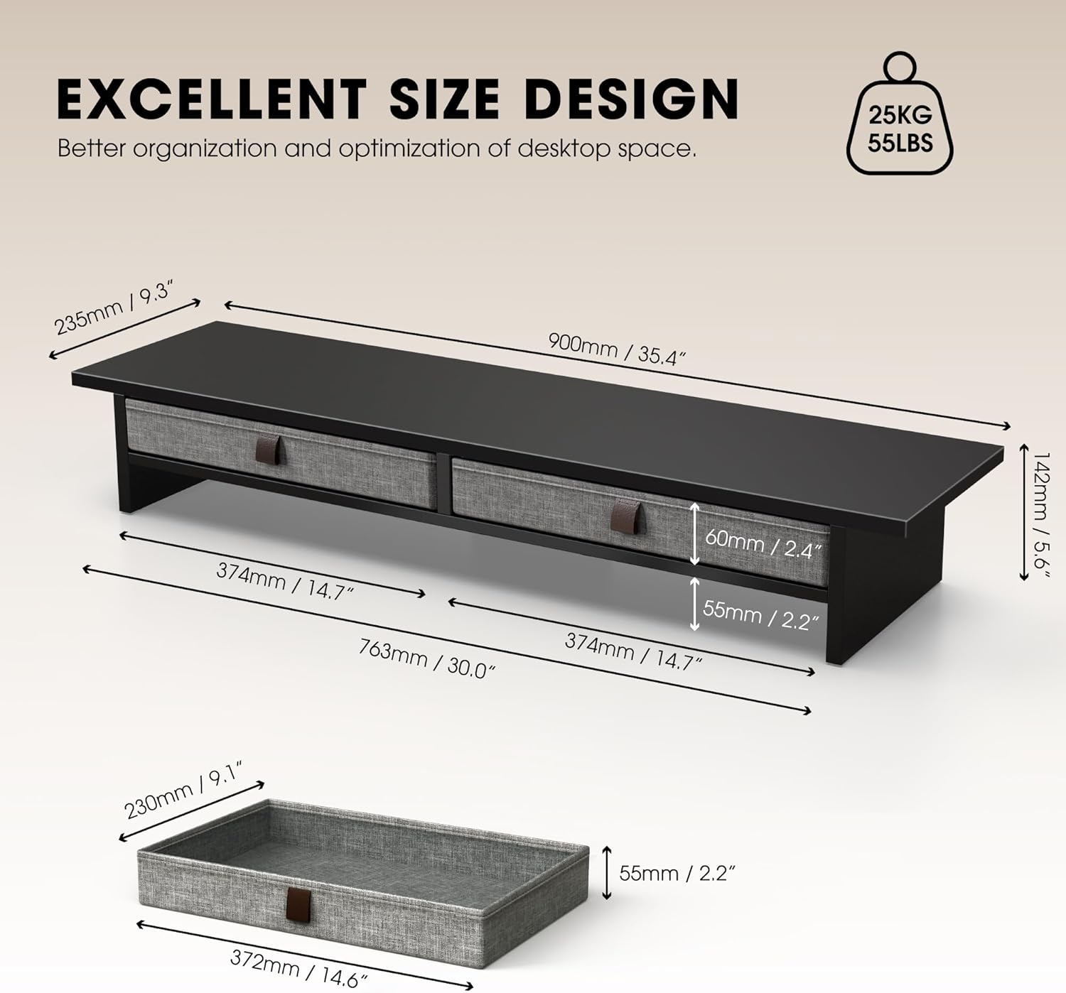 - 【Extra Large Workstation】Equipped with 2 fabric drawers, this monitor stand effortlessly organizes cables, stationery, or office supplies, maximizing desk space while protecting privacy. The 2-tiers structure (35"x9.3") securely holds dual monitors, printers, or TVs, transforming cluttered desks into streamlined workstations.